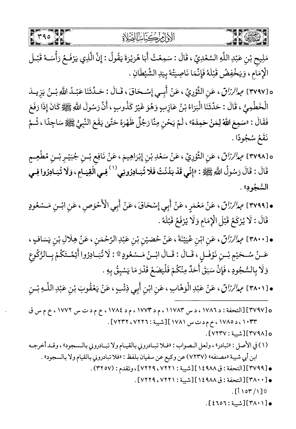 3800- عبد الرزاق، عَنِ ابْنِ عُيَيْنَةَ، عَن حُصَيْنِ بْنِ عَبدِ الرَّحْمَنِ، عَن هِلاَلِ بْنِ يَسَافٍ، عَن سُحَيْمِ بْنِ نَوْفَلٍ قَالَ: قَالَ ابْنُ مَسْعُودٍ: لاَ تُبَادِرُوا أَئِمَّتَكُمْ بِالرُّكُوعِ وَلاَ بِالسُّجُودِ، فَإِنْ سَبَقَ أَحَدٌ مِنْكُمْ فَلْيَضَعْ قَدْرَ مَا يَسْبِقُ بِهِ.