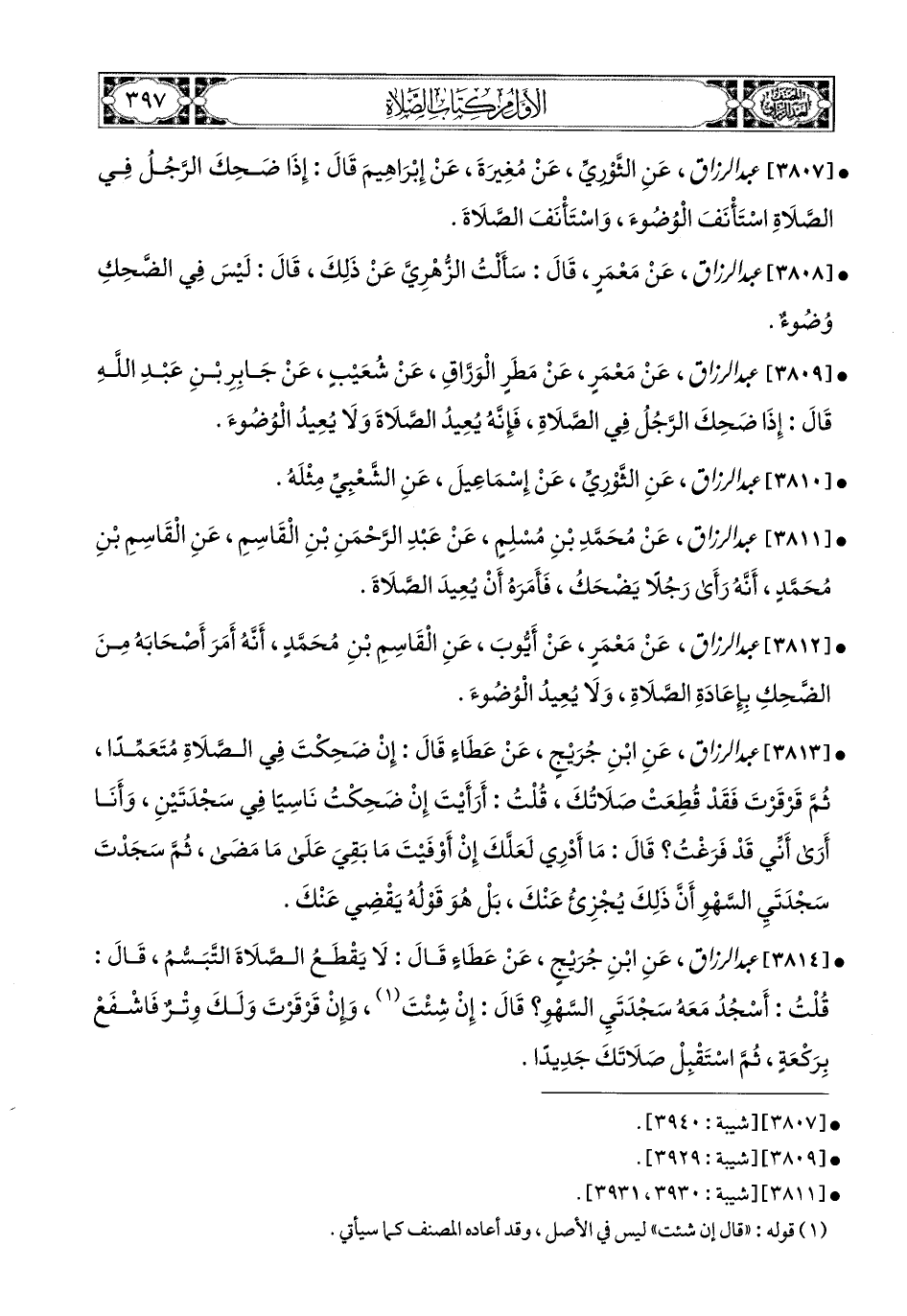 3812- عبد الرزاق، عَنْ مَعْمَرٍ، عَنْ أَيُّوبَ، عَنِ الْقَاسِمِ بْنِ مُحَمَّدٍ؛ أَنَّهُ أَمَرَ أَصْحَابَهُ مِنَ الضَّحِكِ بِإِعَادَةِ الصَّلاَةِ، وَلاَ يُعِيدُ الْوُضُوءَ.