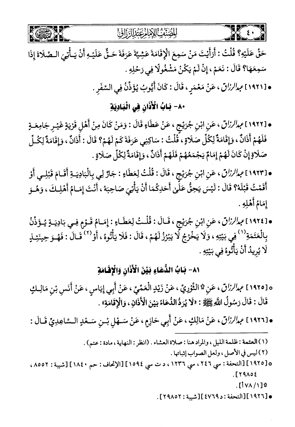 1922- عبد الرزاق، عَنِ ابْنِ جُرَيْجٍ، عَنْ عَطَاءٍ، قَالَ: وَمَنْ كَانَ مِنْ أَهْلِ قَرْيَةٍ غَيْرِ جَامِعَةٍ، فَلَهُمْ أَذَانٌ وَإِقَامَةٌ لِكُلِّ صَلاَةٍ، قُلْتُ: سَاكِنِي عَرَفَةَ كَمْ لَهُمْ؟ قَالَ: أَذَانٌ وَإِقَامَةٌ لِكُلِّ صَلاَةٍ، إِنْ كَانَ لَهُمْ إِمَامٌ يَجْمَعُهُمْ فَلَهُمْ أَذَانٌ وَإِقَامَةٌ لِكُلِّ صَلاَةٍ.