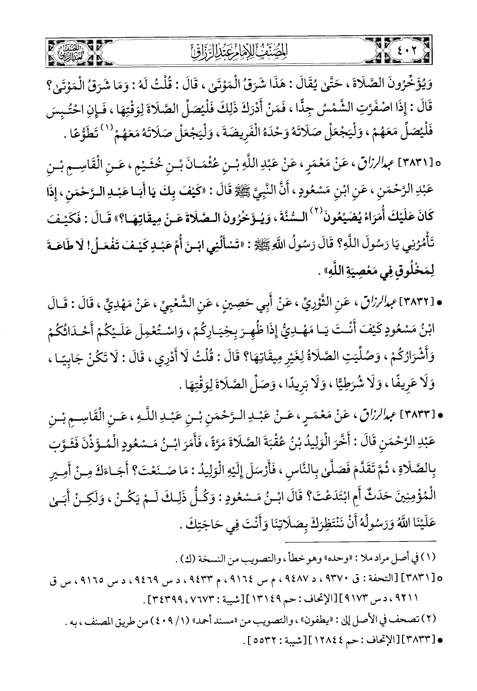 3831- عبد الرزاق، عَنْ مَعْمَرٍ، عَنْ عَبدِ اللهِ بْنِ عُثْمَانَ بْنِ خُثَيْمٍ، عَنِ الْقَاسِمِ بْنِ عَبدِ الرَّحْمَنِ، عَنِ ابْنِ مَسْعُودٍ، أَنَّ النَّبِيَّ صَلَّى اللهُ عَلَيْهِ وَسَلَّمَ قَالَ: كَيْفَ بِكَ يَا أَبَا عَبدِ الرَّحْمَنِ إِذَا كَانَ عَلَيْكَ أُمَرَاءُ يُضَيِّعُونَ السُّنَّةَ، وَيُؤَخِّرُونَ الصَّلاَةَ عَن مِيقَاتِهَا؟ قَالَ: فَكَيْفَ تَأْمُرُنِي يَا رَسُولَ اللهِ؟ قَالَ رَسُولُ اللهِ صَلَّى اللهُ عَلَيْهِ وَسَلَّمَ: تَسْأَلُنِي ابْنَ أُمِّ عَبدٍ كَيْفَ تَفْعَلُ؟ لاَ طَاعَةَ لِمَخْلُوقٍ فِي مَعْصِيَةِ اللهِ.