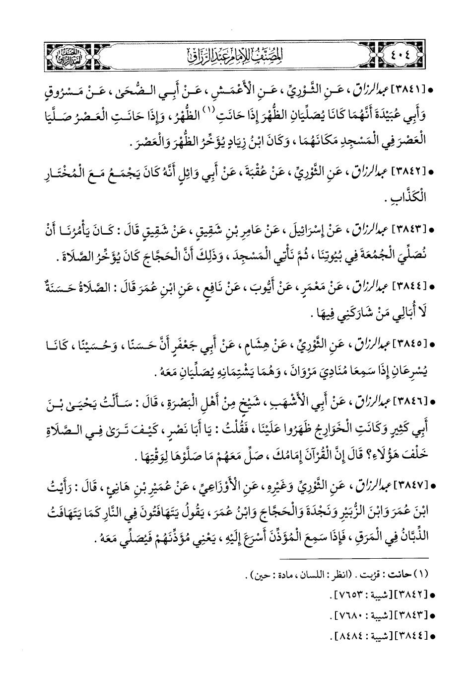3841- عبد الرزاق، عَنِ الثَّورِيِّ، عَنِ الأَعمَشِ، عَنْ أَبِي الضُّحَى، عَنْ مَسْرُوقٍ، وَأَبِي عُبَيْدَةَ، أَنَّهُمَا كَانَا يُصَلِّيَانِ الظُّهْرَ إِذَا حَانَتِ الظُّهْرُ، وَإِذَا حَانَتِ الْعَصْرُ صَلَّيَا الْعَصْرَ فِي المَسْجِدِ مَكَانَهُمَا، وَكَانَ ابْنُ زِيَادٍ يُؤَخِّرُ الظُّهْرَ وَالْعَصْرَ.
