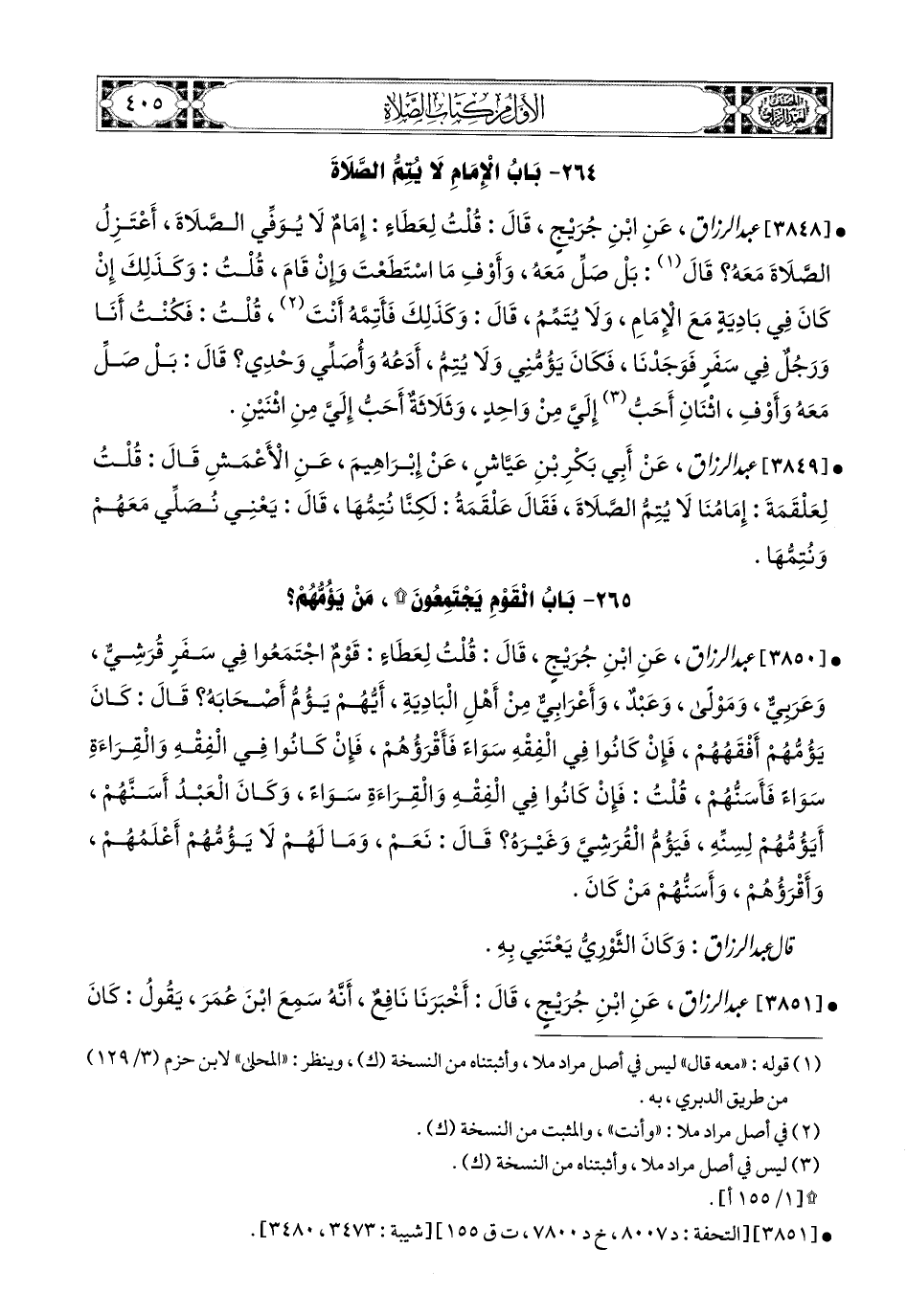 3849- عبد الرزاق، عَنْ أَبِي بَكْرِ بْنِ عَيَّاشٍ، عَن إِبرَاهِيمَ، عَنِ الأَعمَشِ، قَالَ: قُلْتُ لِعَلْقَمَةَ: إِمَامُنَا لاَ يُتِمُّ الصَّلاَةَ، فَقَالَ عَلْقَمَةُ: لَكِنَّا نُتِمُّهَا، قَالَ: يَعْنِي نُصَلِّي مَعَهُمْ وَنُتِمُّهَا.