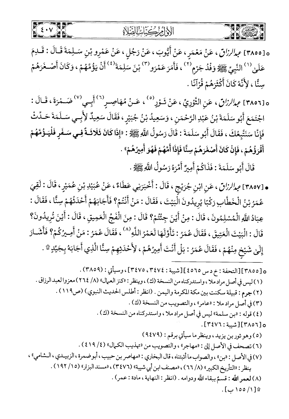 3856 - عبد الرزاق، عَنِ الثَّورِيِّ، عَن ثَوْرٍ، عَن مُهَاصِرٍ أَبِي ضَمْرَةَ (1)، قَالَ: اجْتَمَعَ أَبو سَلَمَةَ بن عَبدِ الرَّحْمَنِ، وَسَعيدُ بن جُبَيرٍ، فَقَالَ سَعيدٌ لأَبِي سَلَمَةَ: حَدِّثْ، فَإِنَّا سَنَتَّبِعُكَ، فَقَالَ أَبو سَلَمَةَ: قَالَ رَسُولُ اللهِ صَلَّى اللهُ عَلَيْهِ وَسَلَّمَ: إِذَا كَانَ ثَلاَثَةٌ فِي سَفَرٍ، فَلْيَؤُمَّهُمْ أَقْرَؤُهُمْ، فَإِنْ كَانَ أَصْغَرَهُمْ سِنًّا، فَإِذَا أَمَّهُمْ فَهُوَ أَمِيرُهُمْ، قَالَ أَبو سَلَمَةَ: فَذَاكُمْ أَمِيرٌ أَمَّرَهُ رَسُولُ اللهِ صَلَّى اللهُ عَلَيْهِ وَسَلَّمَ.