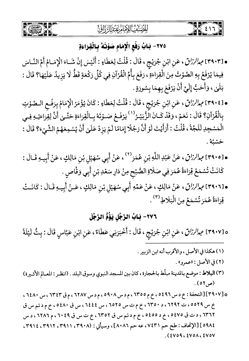 3906- عبد الرزاق، عَنْ مَالِكٍ، عَنْ عَمِّهِ أَبِي سُهَيْلِ بْنِ مَالِكٍ، عَنْ أَبِيهِ، قَالَ: كَانَتْ قِرَاءَةُ عُمَرَ تُسْمَعُ مِنَ الْبَلاَطِ.