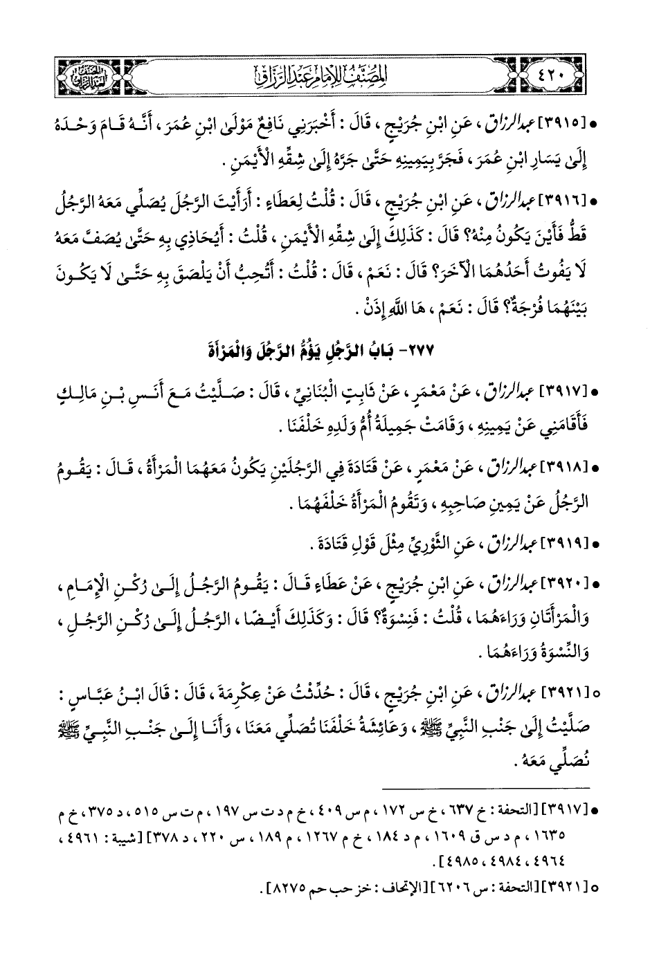 3920- عبد الرزاق، عَنِ ابْنِ جُرَيْجٍ، عَنْ عَطَاءٍ، قَالَ: يَقُومُ الرَّجُلُ إِلَى رُكْنِ الإِمَامِ، وَالمَرْأَتَانِ وَرَاءَهُمَا، قُلْتُ: فَنِسْوَةٌ؟ قَالَ: وَكَذَلِكَ أَيْضًا، الرَّجُلُ إِلَى رُكْنِ الرَّجُلِ، وَالنِّسْوَةُ وَرَاءَهُمَا.