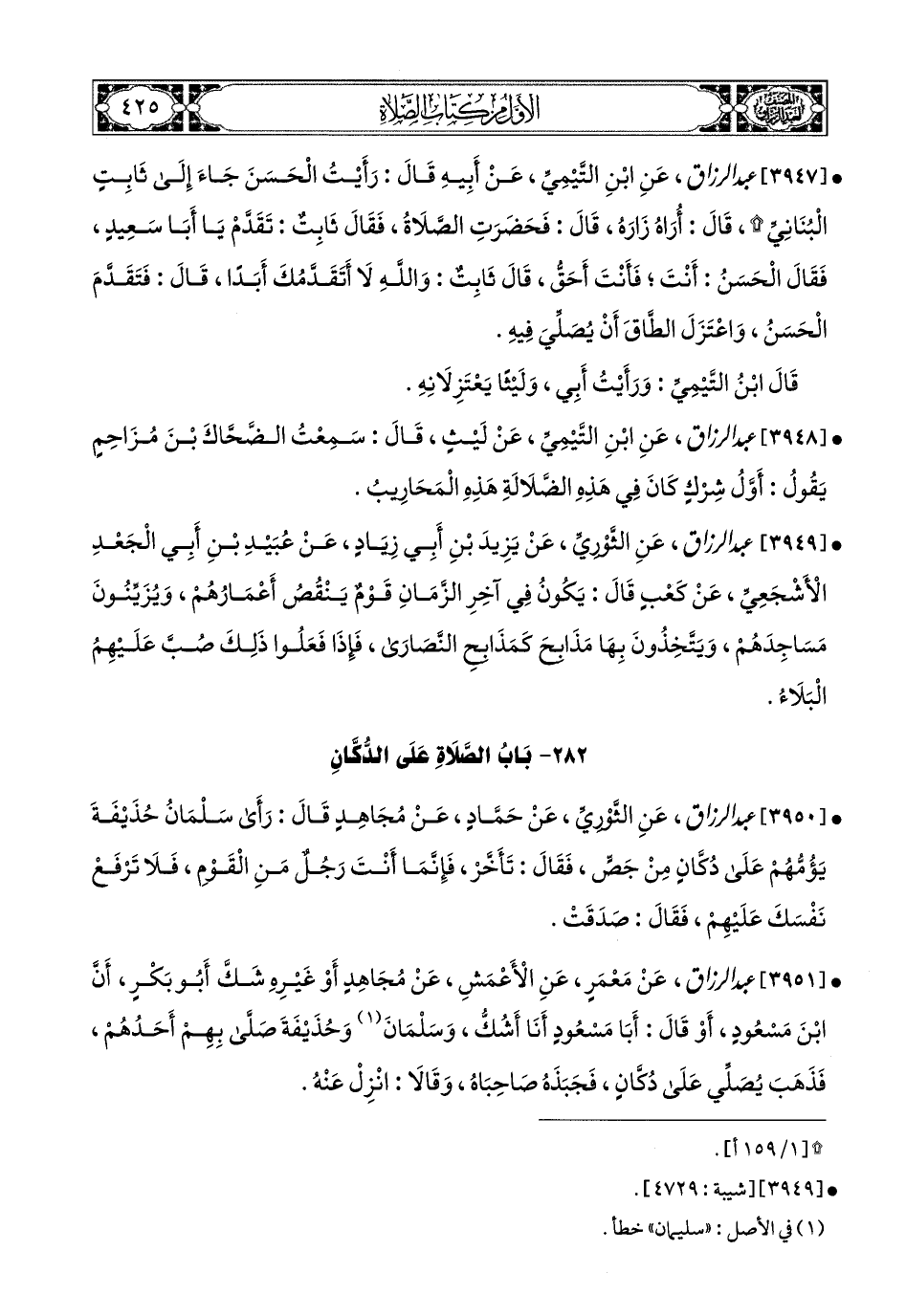 3951- عبد الرزاق، عَنْ مَعْمَرٍ، عَنِ الأَعمَشِ، عَن مُجاهِدٍ، أَوْ غَيْرِهِ، شَكَّ أَبو بَكْرٍ، أَنَّ ابْنَ مَسْعُودٍ، أَوْ قَالَ: أَبَا مَسْعُودٍ، أَنَا أَشُكُّ، وَسَلْمَانَ، وَحُذَيْفَةَ صَلَّى بِهِمْ أَحَدُهُمْ، فَذَهَبَ يُصَلِّي عَلَى دُكَّانٍ، فَجَبَذَهُ صَاحِبَاهُ، وَقَالاَ: انْزِلْ عَنْهُ.