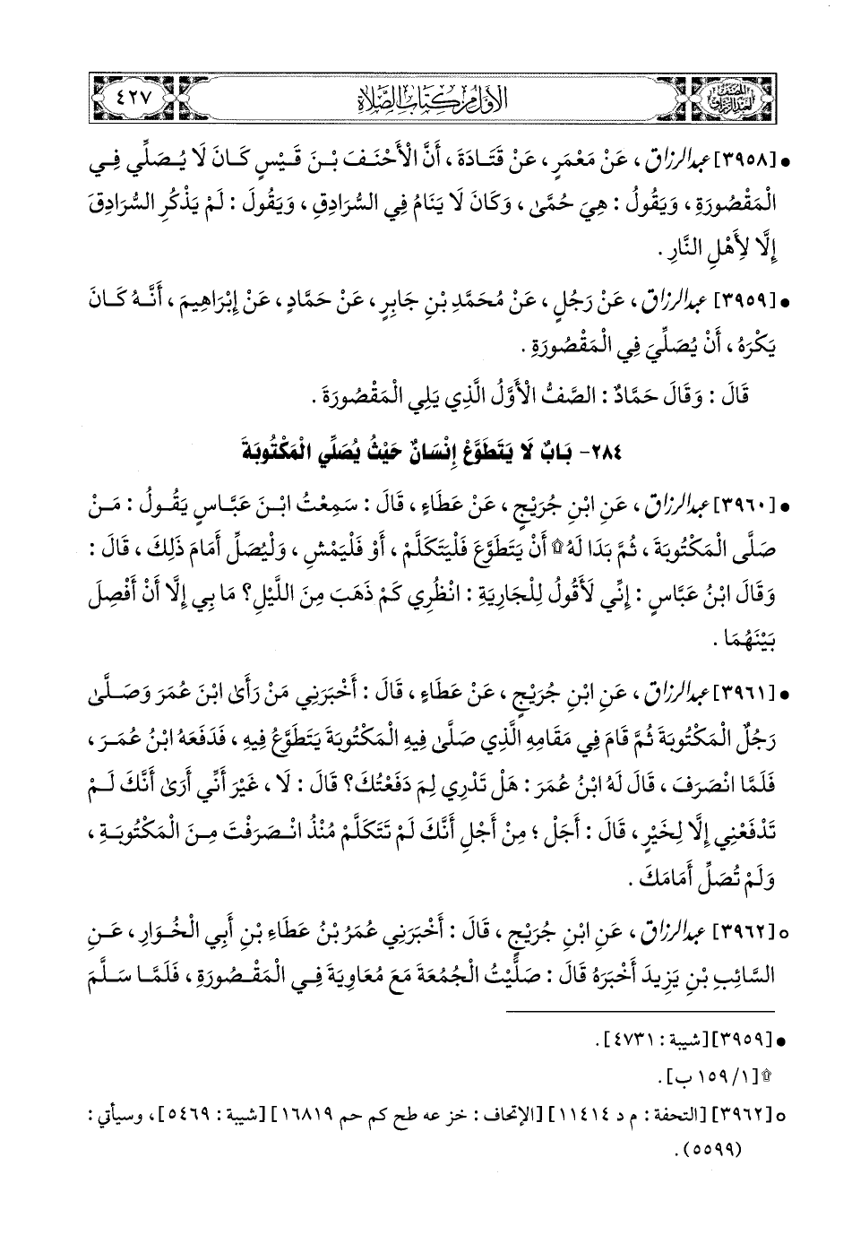 3959- عبد الرزاق، عَن رَجُلٍ، عَن مُحَمَّدِ بْنِ جَابِرٍ، عَن حَمَّادٍ، عَن إِبرَاهِيمَ؛ أَنَّهُ كَانَ يَكْرَهُ أَنْ يُصَلِّيَ فِي المَقْصُورَةِ قَالَ: وَقَالَ حَمَّادٌ: الصَّفُّ الأَوَّلُ الَّذِي يَلِي المَقْصُورَةَ.