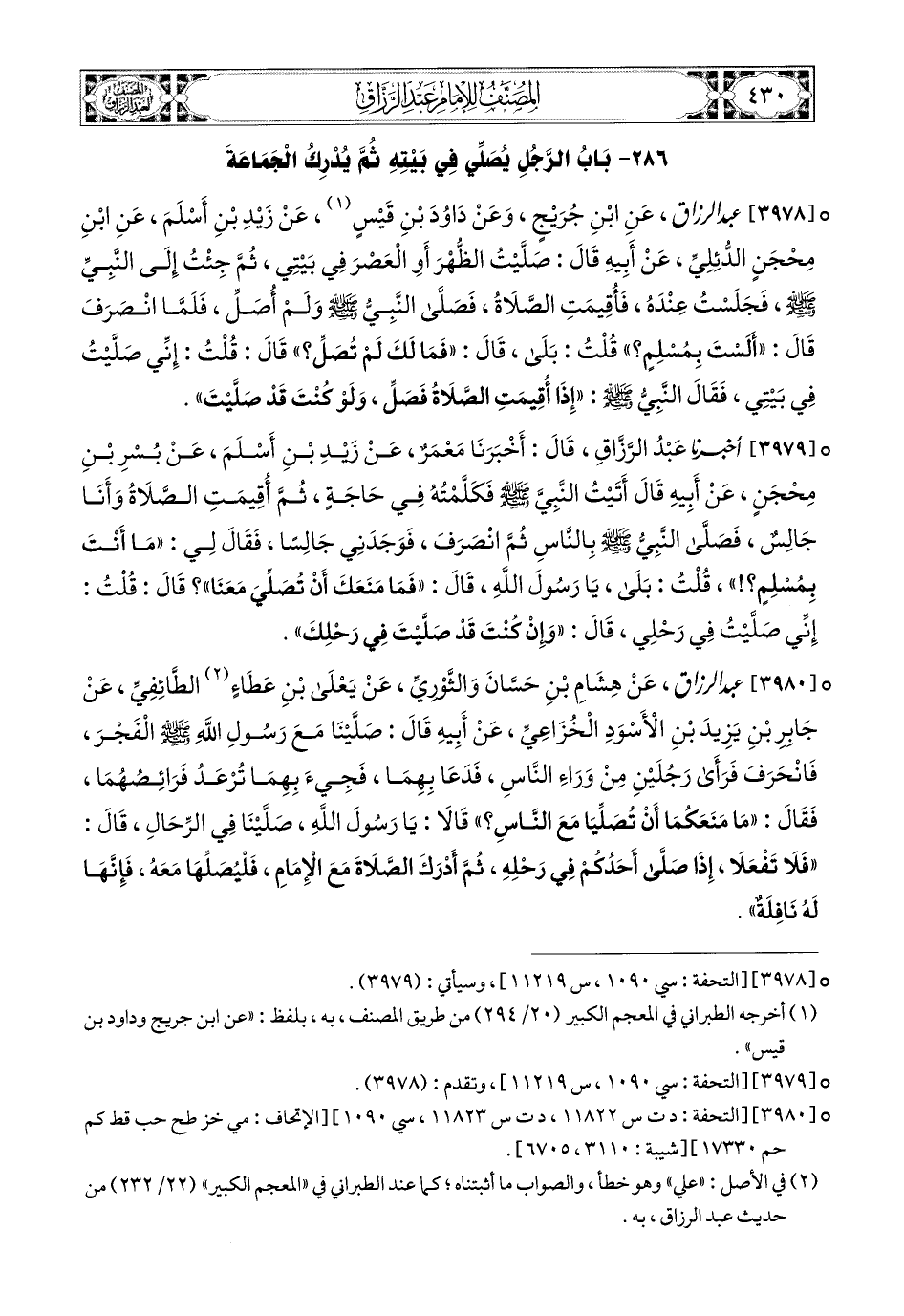 3978- عبد الرزاق، عَنِ ابْنِ جُرَيْجٍ، عَن دَاوُدَ بْنِ قَيْسٍ، عَن زَيْدِ بْنِ أَسْلَمَ، عَنِ ابْنِ مِحْجَنٍ الدُّئِلِيِّ، عَنْ أَبِيهِ، قَالَ: صَلَّيْتُ الظُّهْرَ أَوِ الْعَصْرَ فِي بَيْتِي، ثُمَّ جِئْتُ إِلَى النَّبِيِّ صَلَّى اللهُ عَلَيْهِ وَسَلَّمَ، فَجَلَسْتُ عِنْدَهُ، فَأُقِيمَتِ الصَّلاَةُ، فَصَلَّى النَّبِيُّ صَلَّى اللهُ عَلَيْهِ وَسَلَّمَ وَلَمْ أُصَلِّ، فَلَمَّا انْصَرَفَ قَالَ: أَلَسْتَ بِمُسْلِمٍ؟ قُلْتُ: بَلَى، قَالَ: فَمَا لَكَ لَمْ تُصَلِّ؟ قَالَ: قُلْتُ: إِنِّي صَلَّيْتُ فِي بَيْتِي، فَقَالَ النَّبِيُّ صَلَّى اللهُ عَلَيْهِ وَسَلَّمَ: إِذَا أُقِيمَتِ الصَّلاَةُ فَصَلِّ، وَلَوْ كُنْتَ قَدْ صَلَّيْتَ.
