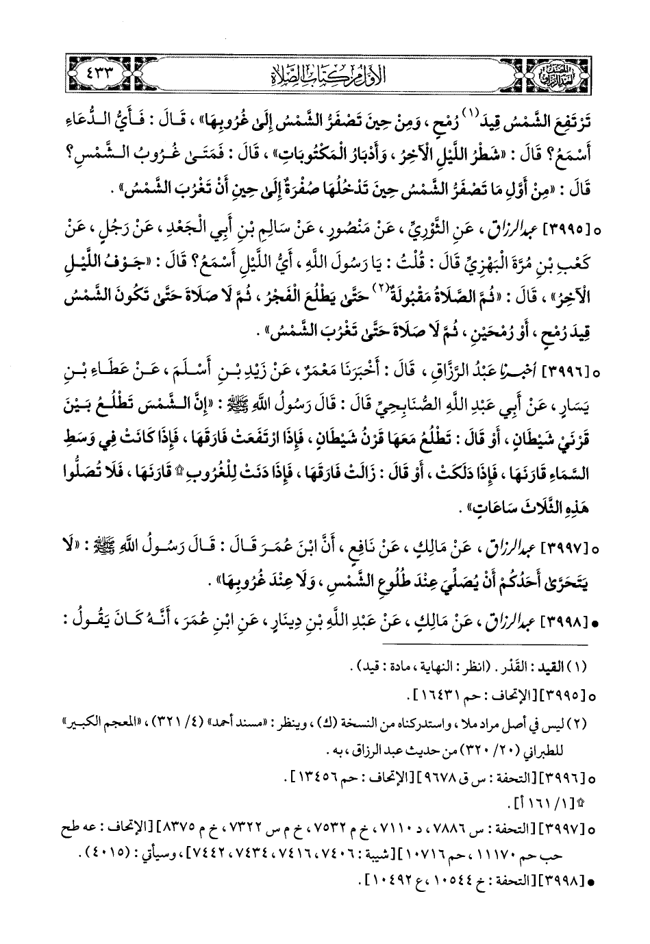 3996- أخبرنا عبد الرزاق، قَالَ: أَخْبَرَنَا مَعْمَرٌ، عَن زَيْدِ بْنِ أَسْلَمَ، عَنْ عَطَاءِ بْنِ يَسَارٍ، عَنْ أَبِي عَبدِ اللهِ الصُّنَابِحِيّ، قَالَ: قَالَ رَسُولُ اللهِ صَلَّى اللهُ عَلَيْهِ وَسَلَّمَ: إِنَّ الشَّمْسَ تَطْلُعُ بَيْنَ قَرْنَيْ شَيْطَانٍ، أَوْ قَالَ: تَطْلُعُ مَعَهَا قَرْنُ شَيْطَانٍ، فَإِذَا ارْتَفَعَتْ فَارَقَهَا، فَإِذَا كَانَتْ فِي وَسَطِ السَّمَاءِ قَارَنَهَا، فَإِذَا دَلَكَتْ، أَوْ قَالَ: زَالَتْ، فَارَقَهَا، فَإِذَا دَنَتْ لِلْغُرُوبِ قَارَنَهَا، فَلاَ تُصَلُّوا هَذِهِ الثَّلاَثَ سَاعَاتٍ.