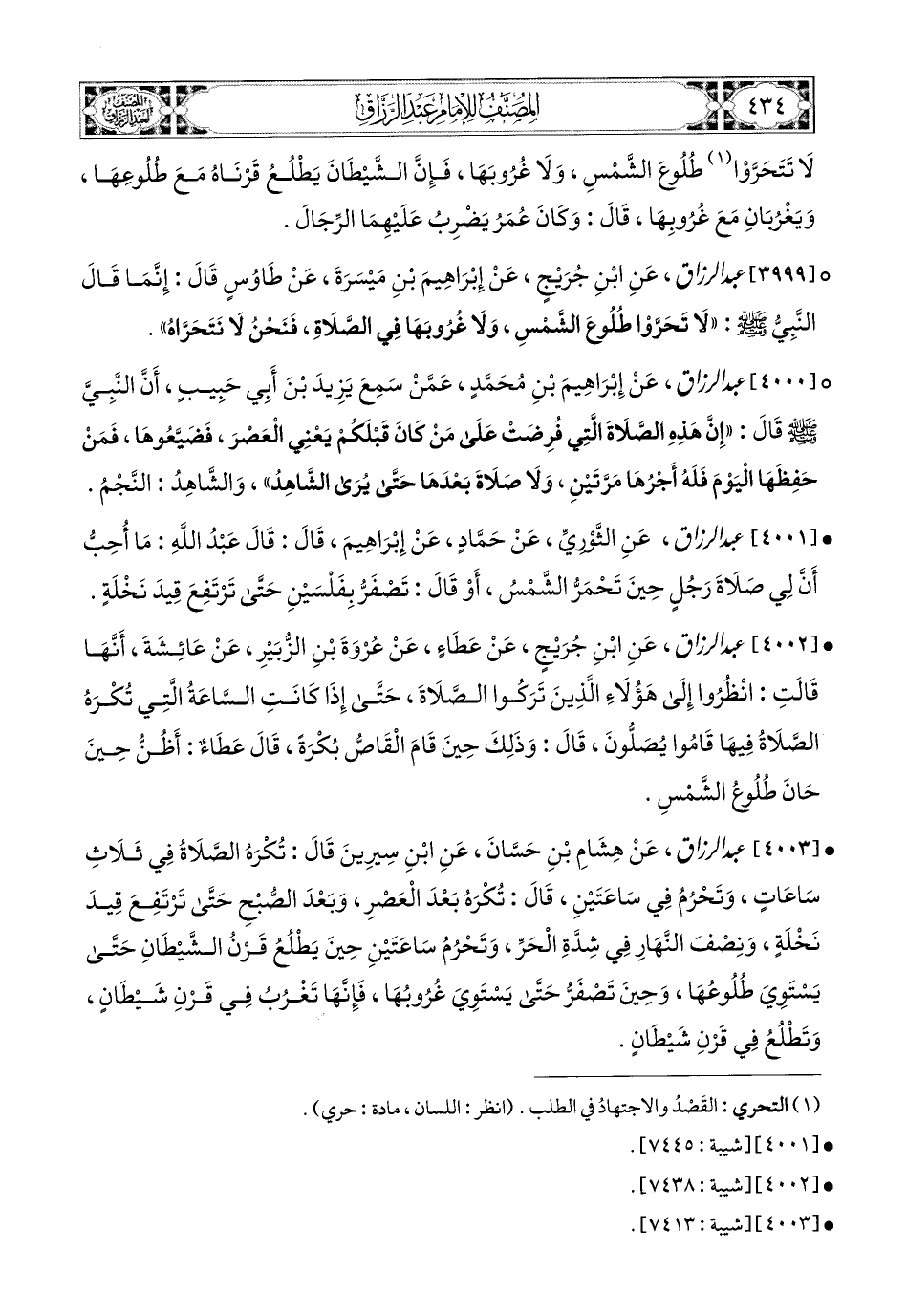 4003 - عبد الرزاق، عَن هِشَامِ بْنِ حَسَّانَ، عَنِ ابْنِ سِيرِينَ، قَالَ: تُكْرَهُ الصَّلاَةُ فِي ثَلاَثِ سَاعَاتٍ، وَتَحْرُمُ فِي سَاعَتَيْنِ، قَالَ: تُكْرَهُ بَعْدَ الْعَصْرِ، وَبَعْدَ الصُّبْحِ، حَتَّى تَرْتَفِعَ قِيدَ نَخْلَةٍ، وَنِصْفَ النَّهَارِ فِي شِدَّةِ الْحَرِّ، وَتَحْرُمُ سَاعَتَيْنِ حِينَ يَطْلُعُ قَرْنُ الشَّيْطَانِ، حَتَّى يَسْتَوِيَ طُلُوعُهَا، وَحِينَ تَصْفَرُّ، حَتَّى يَسْتَوِيَ غُرُوبُهَا، فَإِنَّهَا تَغْرُبُ فِي قَرْنِ شَيْطَانٍ، وَتَطْلُعُ فِي قَرْنِ شَيْطَانٍ.