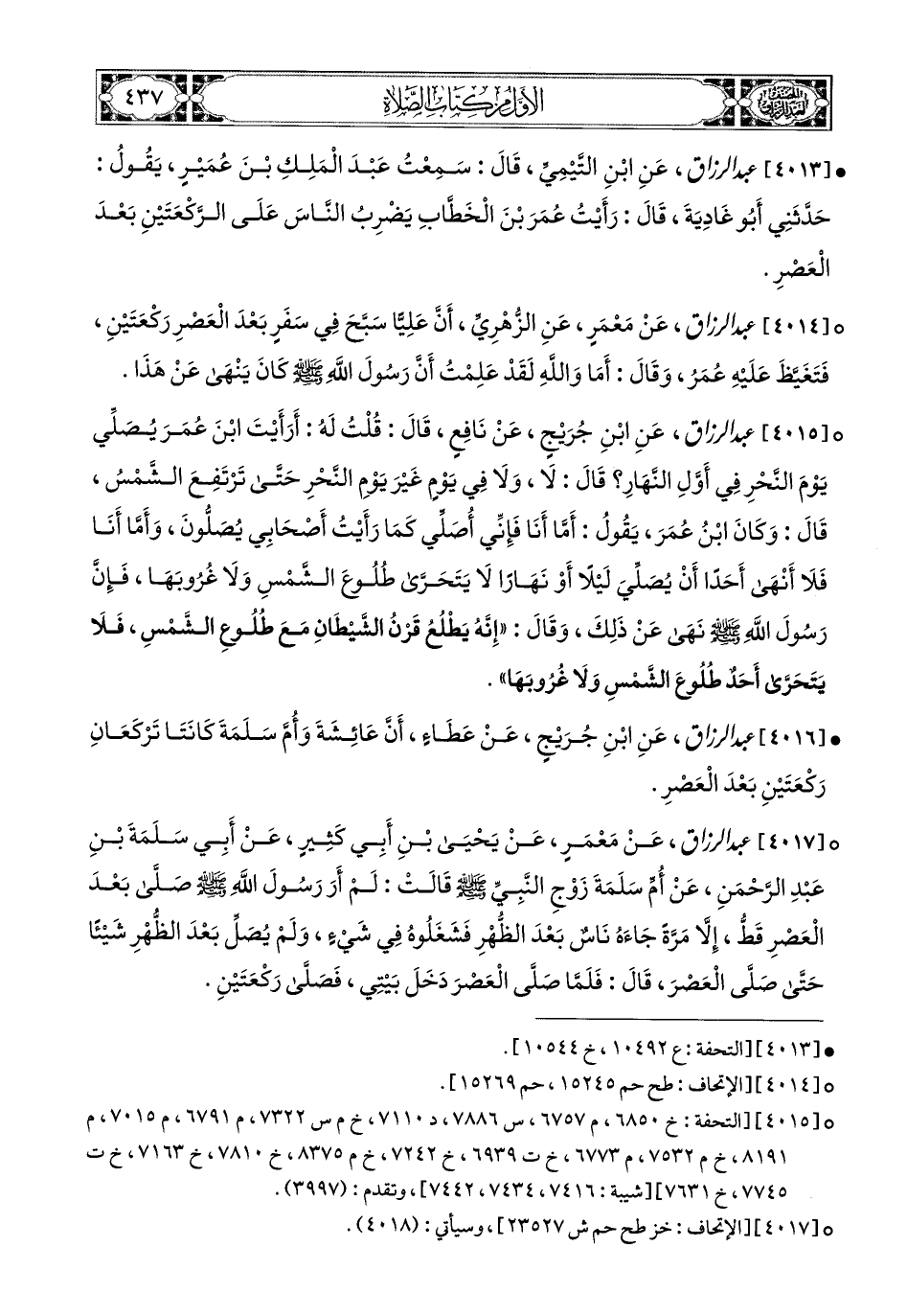 4013 - عبد الرزاق، عَنِ ابْنِ التَّيْمِيِّ، قَالَ: سَمِعْتُ عَبدَ المَلِكِ بْنِ عُمَيْرٍ يَقُولُ: حَدَّثَنِي أَبو غَادِيَةَ قَالَ: رَأَيْتُ عُمَرَ بن الْخَطَّابِ يَضْرِبُ النَّاسَ عَلَى الرَّكْعَتَيْنِ بَعْدَ الْعَصْرِ.