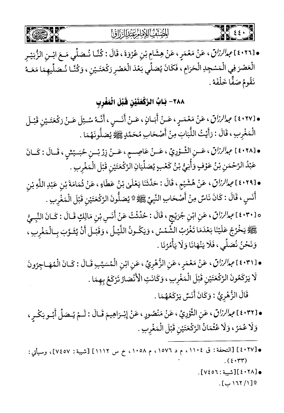 4029 - عبد الرزاق، عَن هُشَيْمٍ، قَالَ: حَدَّثنا يَعْلَى بن عَطَاءٍ، عَن ثُمَامَةَ بْنِ عَبدِ اللهِ بْنِ أَنَسٍ قَالَ: كَانَ نَاسٌ مِنْ أَصْحَابِ النَّبِيِّ صَلَّى اللهُ عَلَيْهِ وَسَلَّمَ يُصَلُّونَ الرَّكْعَتَيْنِ قَبْلَ المَغْرِبِ.