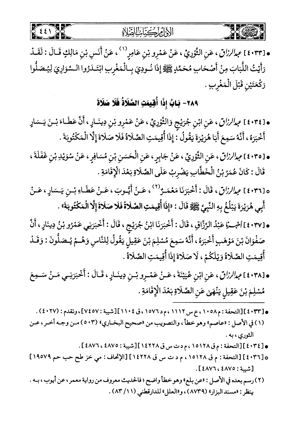 4036 - عبد الرزاق، قَالَ: أَخْبَرَنَا مَعْمَرٌ، عَنْ أَيُّوبَ، عَنْ عَمْرِو بنِ دِينَارٍ، عَنْ عَطَاءِ بْنِ يَسَارٍ (1)، عَنْ أَبِي هُرَيرَةَ، يَبْلُغُ بِهِ النَّبِيَّ صَلَّى اللهُ عَلَيْهِ وَسَلَّمَ قَالَ: إِذَا أُقِيمَتِ الصَّلاَةُ فَلاَ صَلاَةَ إِلاَّ المَكْتُوبَةُ.