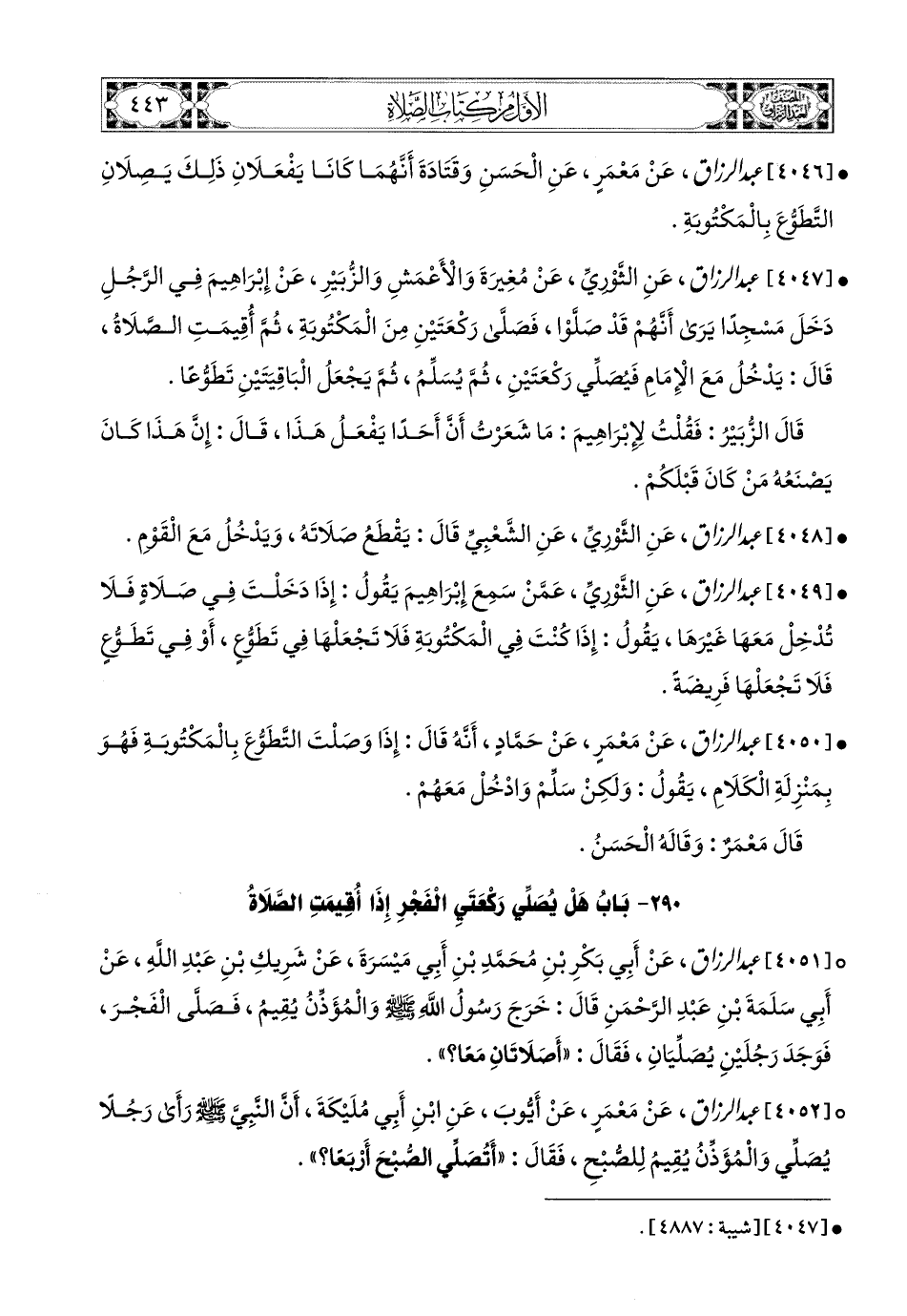 4052 - عبد الرزاق، عَنْ مَعْمَرٍ، عَنْ أَيُّوبَ، عَنِ ابْنِ أَبِي مُلَيْكَةَ، أَنَّ النَّبِيَّ صَلَّى اللهُ عَلَيْهِ وَسَلَّمَ رَأَى رَجُلاً يُصَلِّي وَالمُؤَذِّنُ يُقِيمُ لِلصُّبْحِ، فَقَالَ: أَتُصَلِّي الصُّبْحَ أَرْبَعًا؟.