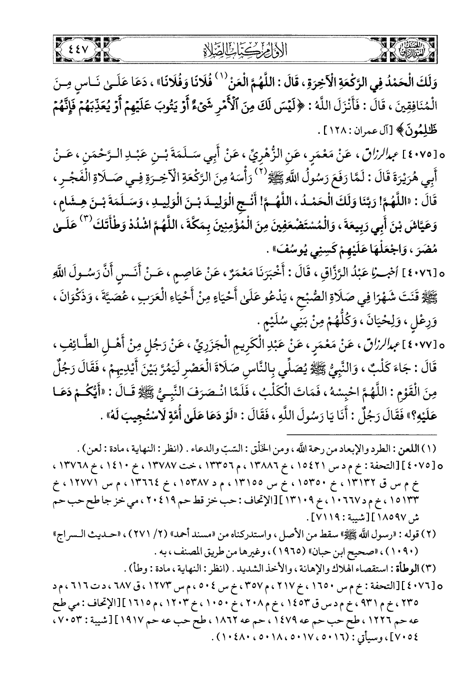 4075 - عبد الرزاق، عَنْ مَعْمَرٍ، عَنِ الزُّهْرِيِّ، عَنْ أَبِي سَلَمَةَ بْنِ عَبدِ الرَّحْمَنِ، عَنْ أَبِي هُرَيرَةَ، قَالَ: لَمَّا رَفَعَ [رَسُولُ اللهِ صَلى الله عَلَيهِ وسَلمَ] (1) رَأْسَهُ مِنَ الرَّكْعَةِ الآخِرَةِ فِي صَلاَةِ الْفَجْرِ قَالَ: اللهُمَّ رَبَّنَا وَلَكَ الْحَمْدُ، اللهُمَّ أَنْجِ الْوَلِيدَ بن الْوَلِيدِ، وَسَلَمَةَ بن هِشَامٍ، وَعَيَّاشَ بن أَبِي رَبِيعَةَ، وَالمُسْتَضْعَفِينَ مِنَ المُؤْمِنِينَ بِمَكَّةَ، اللهُمَّ اشْدُدْ وَطْأَتَكَ عَلَى مُضَرَ، وَاجْعَلْهَا عَلَيْهِمْ كَسِنِي يُوسُفَ.