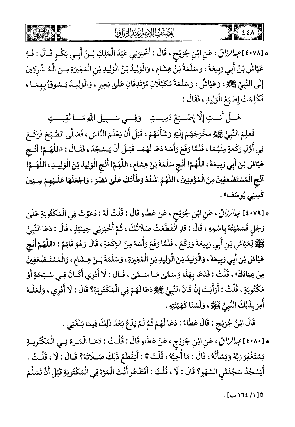 4079- عبد الرزاق، عَنِ ابْنِ جُرَيْجٍ، عَنْ عَطَاءٍ، قَالَ: قُلْتُ لَهُ: دَعَوْتُ فِي المَكْتُوبَةِ عَلَى رَجُلٍ، فَسَمَّيْتُهُ بِاسْمِهِ، قَالَ: قَدِ انْقَطَعَتْ صَلاَتُكَ، ثُمَّ أَخْبَرَنِي حِينَئِذٍ، قَالَ: دَعَا النَّبِيُّ صَلَّى اللهُ عَلَيْهِ وَسَلَّمَ لِعَيَّاشِ بْنِ أَبِي رَبِيعَةَ وَرَكَعَ، فَلَمَّا رَفَعَ رَأْسَهُ مِنَ الرَّكْعَةِ، قَالَ وَهُوَ قَائِمٌ: اللهُمَّ أَنْجِ عَيَّاشَ بن أَبِي رَبِيعَةَ، وَالْوَلِيدَ بن الْوَلِيدِ بْنِ المُغِيرَةِ، وَسَلَمَةَ بن هِشَامٍ، وَالمُسْتَضْعَفِينَ مِنْ عِبَادَكَ، قُلْتُ: فَدَعَا بِهَذَا وَسَمَّى مَا سَمَّى؟ قَالَ: لاَ أَدْرِي أَكَانَ فِي سُبْحَةٍ، أَوْ مَكْتُوبَةٍ، قُلْتُ: أَرَأَيْتَ إِنْ كَانَ النَّبِيُّ صَلَّى اللهُ عَلَيْهِ وَسَلَّمَ دَعَا لَهُمْ فِي المَكْتُوبَةِ؟ قَالَ: لاَ أَدْرِي، وَلَعَلَّهُ أُمِرَ بِذَلِكَ النَّبِيُّ صَلَّى اللهُ عَلَيْهِ وَسَلَّمَ، وَلَسْنَا كَهَيْئَتِهِ، قَالَ ابْنُ جُرَيْجٍ: قَالَ عَطَاءٌ: دَعَا لَهُمْ، ثُمَّ لَمْ يَدْعُ بَعْدَ ذَلِكَ فِيمَا بَلَغَنِي.