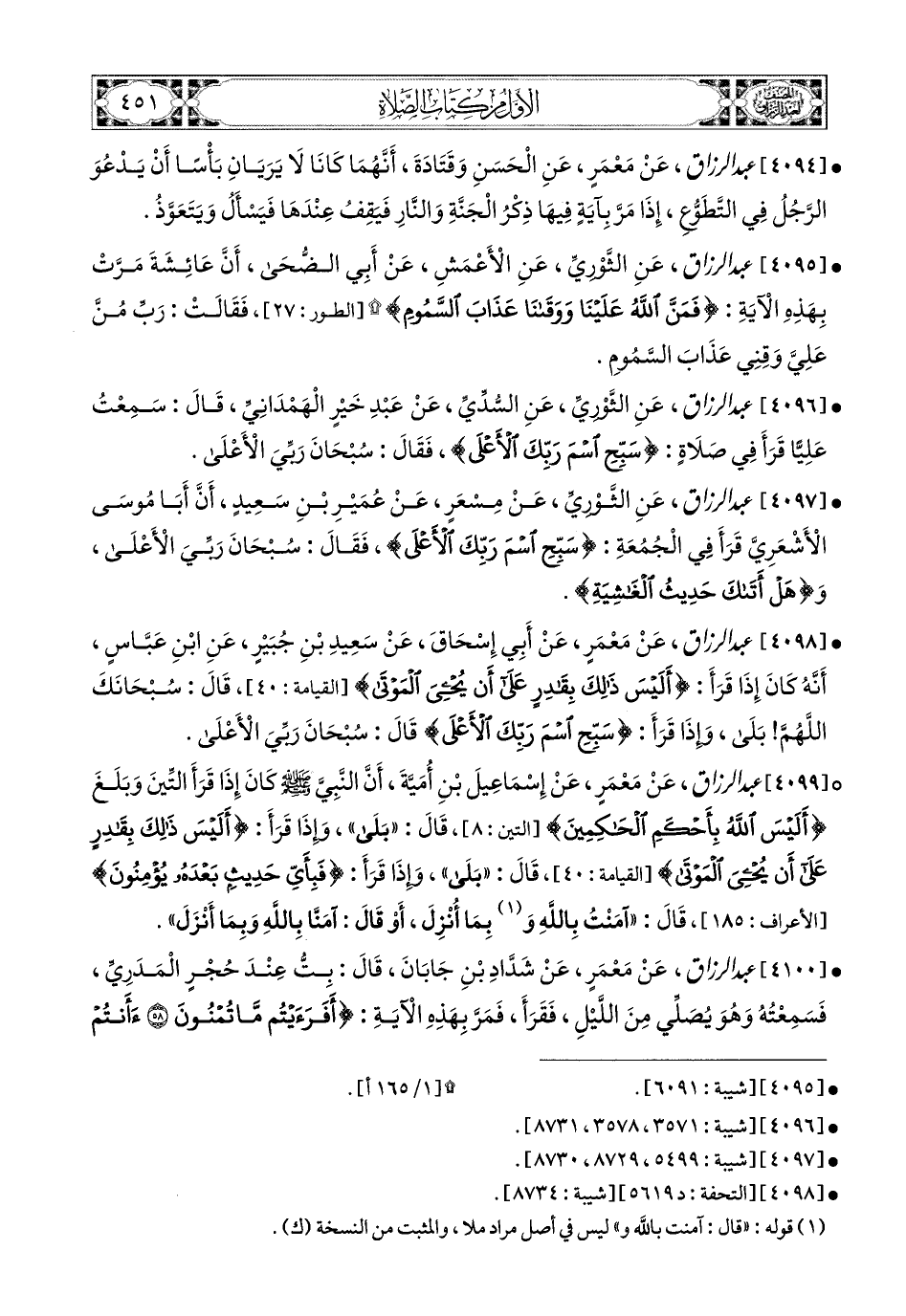 4099- عبد الرزاق، عَنْ مَعْمَرٍ، عَن إِسْمَاعِيلَ بْنِ أُمَيَّةَ، أَنَّ النَّبِيَّ صَلَّى اللهُ عَلَيْهِ وَسَلَّمَ كَانَ إِذَا قَرَأَ التِّينَ، وَبَلَغَ: {أَلَيْسَ اللهُ بِأَحْكَمِ الْحَاكِمِينَ}، قَالَ: بَلَى، وَإِذَا قَرَأَ: {أَلَيْسَ ذَلِكَ بِقَادِرٍ عَلَى أَنْ يُحْيِيَ المَوْتَى}، قَالَ: بَلَى، وَإِذَا قَرَأَ: {فَبِأَيِّ حَدِيثٍ بَعْدَهُ يُؤْمِنُونَ}، قَالَ: آمَنْتُ بِاللهِ وَبِمَا أُنْزِلَ، أَوْ قَالَ: آمَنَّا باللهِ وَبِمَا أَنْزَلَ.
