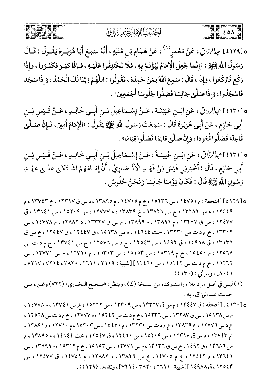 4129- عبد الرزاق، عَنْ مَعْمَرٍ، عَن هَمَّامِ بْنِ مُنَبِّهٍ، أَنَّهُ سَمِعَ أَبَا هُرَيرَةَ يَقُولُ: قَالَ رَسُولُ اللهِ صَلَّى اللهُ عَلَيْهِ وَسَلَّمَ: إِنَّمَا جُعِلَ الإِمَامُ لِيُؤْتَمَّ بِهِ، فَلاَ تَخْتَلِفُوا عَلَيْهِ، فَإِذَا كَبَّرَ فَكَبِّرُوا، وَإِذَا رَكَعَ فَارْكَعُوا، وَإِذَا قَالَ: سَمِعَ اللهُ لِمَنْ حَمِدَهُ، فَقُولُوا: اللهُمَّ رَبَّنَا لَكَ الْحَمْدُ، وَإِذَا سَجَدَ فَاسْجُدُوا، وَإِذَا صَلَّى جَالِسًا، فَصَلُّوا جُلُوسًا أَجْمَعِينَ.