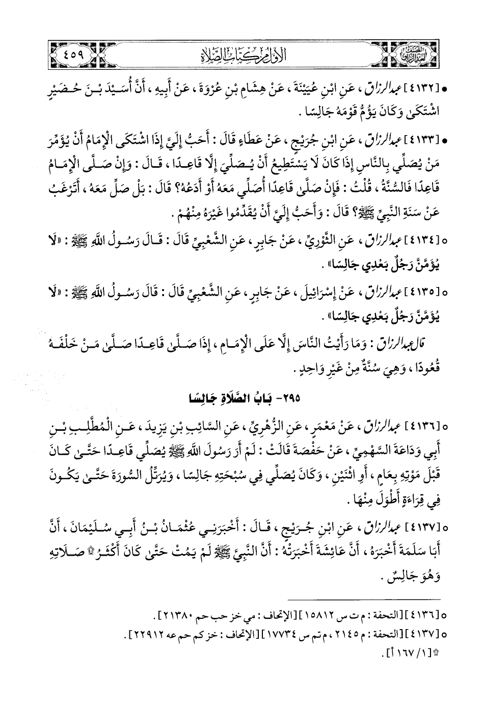 4132- عبد الرزاق، عَنِ ابْنِ عُيَيْنَةَ، عَن هِشَامِ بْنِ عُرْوَةَ، عَنْ أَبِيهِ؛ أَنَّ أُسَيْدَ بن حُضَيْرٍ اشْتَكَى وَكَانَ يَؤُمُّ قَوْمَهُ جَالِسًا.