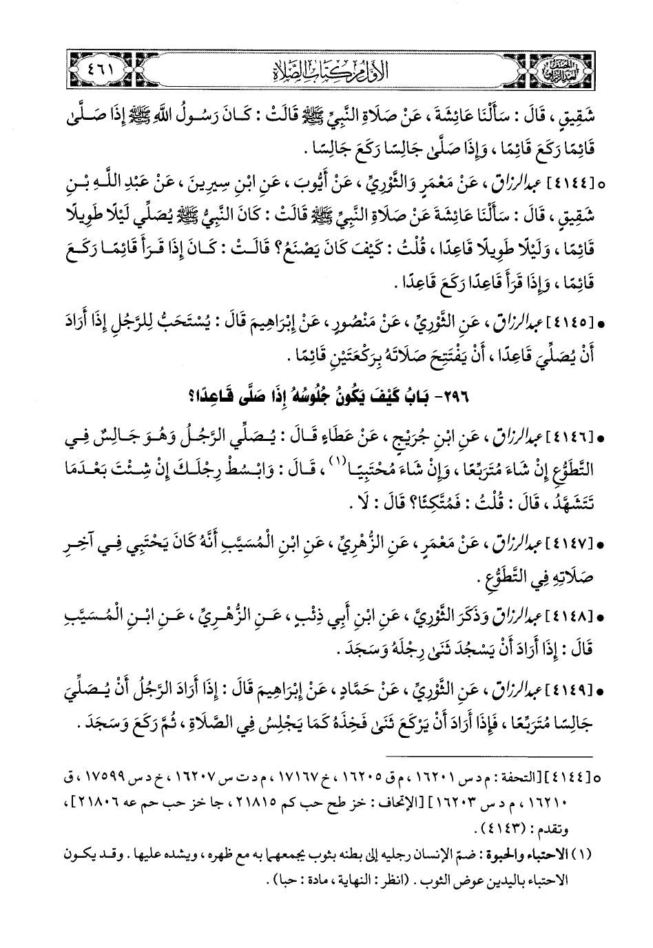 4147- عبد الرزاق، عَنْ مَعْمَرٍ، عَنِ الزُّهْرِيِّ، عَنِ ابْنِ المُسَيَّبِ؛ أَنَّهُ كَانَ يَحْتَبِي فِي آخِرِ صَلاَتِهِ فِي التَّطَوُّعِ.