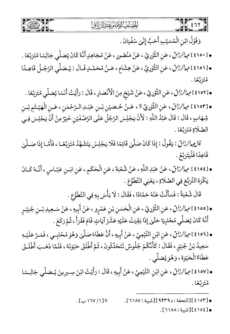 4150- عبد الرزاق، عَنِ الثَّورِيِّ، عَنْ مَنصُورٍ، عَن مُجاهِدٍ؛ أَنَّهُ كَانَ يُصَلِّي جَالِسًا مُتَرَبِّعًا.