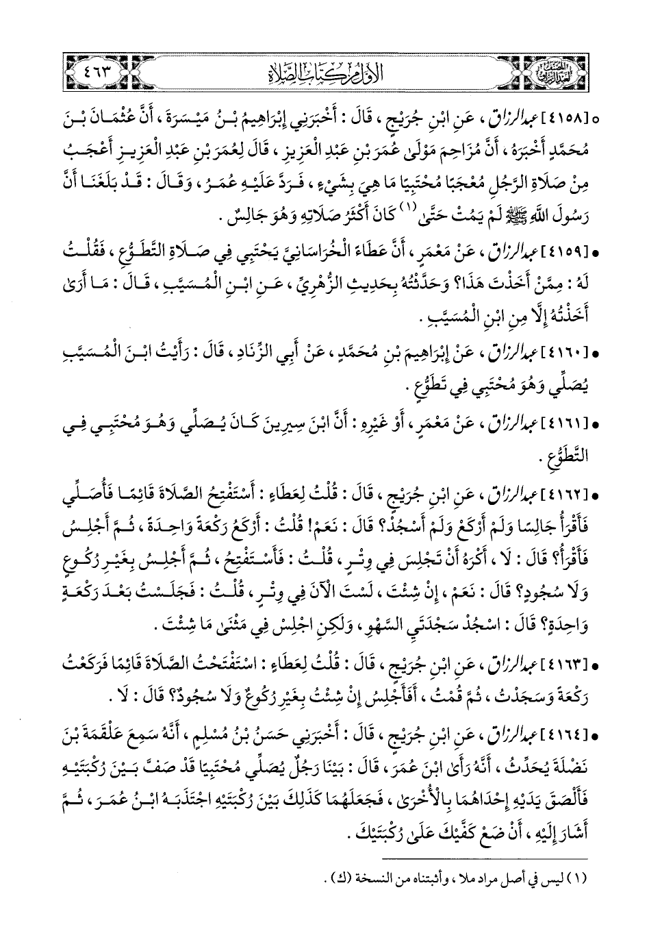 4158- عبد الرزاق، عَنِ ابْنِ جُرَيْجٍ، قَالَ: أَخْبَرَنِي إِبرَاهِيمُ بن مَيْسَرَةَ، أَنَّ عُثْمَانَ بن مُحَمَّدٍ أَخْبَرَهُ، أَنَّ مُزَاحِمَ، مَوْلَى عُمَرَ بْنِ عَبدِ الْعَزِيزِ قَالَ لِعُمَرَ بْنِ عَبدِ الْعَزِيزِ: أَعْجَبُ مِنْ صَلاَةِ الرَّجُلِ مُعْجَبًا مُحْتَبِيًا مَا هِيَ بِشَيْءٍ، فَرَدَّ عَلَيْهِ عُمَرُ وَقَالَ: قَدْ بَلَغَنَا أَنَّ رَسُولَ اللهِ صَلَّى اللهُ عَلَيْهِ وَسَلَّمَ لَمْ يَمُتْ حَتَّى كَانَ أَكْثَرُ صَلاَتِهِ وَهُوَ جَالِسٌ.