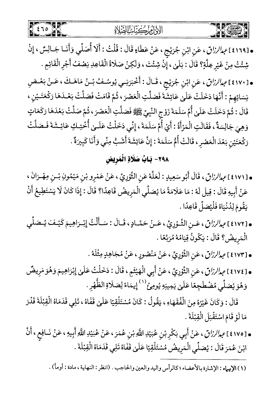4174- عبد الرزاق، عَنِ الثَّورِيِّ، عَنْ أَبِي الْهَيْثَمِ قَالَ: دَخَلْتُ عَلَى إِبرَاهِيمَ وَهُوَ مَرِيضٌ وَهُوَ يُصَلِّي مُضْطَجِعًا عَلَى يَمِينِهِ، يُومِئُ إِيمَاءً لِصَلاَةِ الظُّهْرِ، قَالَ: وَكَانَ غَيْرُهُ مِنَ الْفُقَهَاءِ يَقُولُ: كَانَ مُسْتَلْقِيًا عَلَى قَفَاهُ، تَلِي قَدَمَاهُ الْقِبْلَةَ، قَدْرَ مَا لَوْ قَامَ اسْتَقْبَلَ الْقِبْلَةَ.