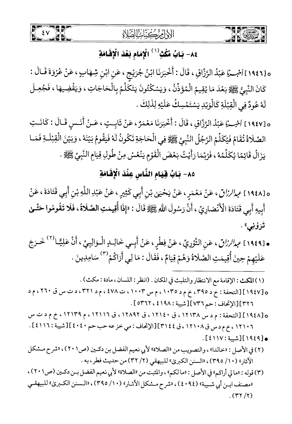 1948- عبد الرزاق، عَنْ مَعْمَرٍ، عَن يَحيَى بنِ أَبِي كَثِيرٍ، عَنْ عَبدِ اللهِ بْنِ أَبِي قَتَادَةَ، عَنْ أَبِيهِ أَبِي قَتَادَةَ الأَنْصَارِيِّ، أَنَّ رَسُولَ اللهِ صَلَّى اللهُ عَلَيْهِ وَسَلَّمَ قَالَ: إِذَا أُقِيمَتِ الصَّلاَةُ فَلاَ تَقُومُوا حَتَّى تَرَوْنِي.