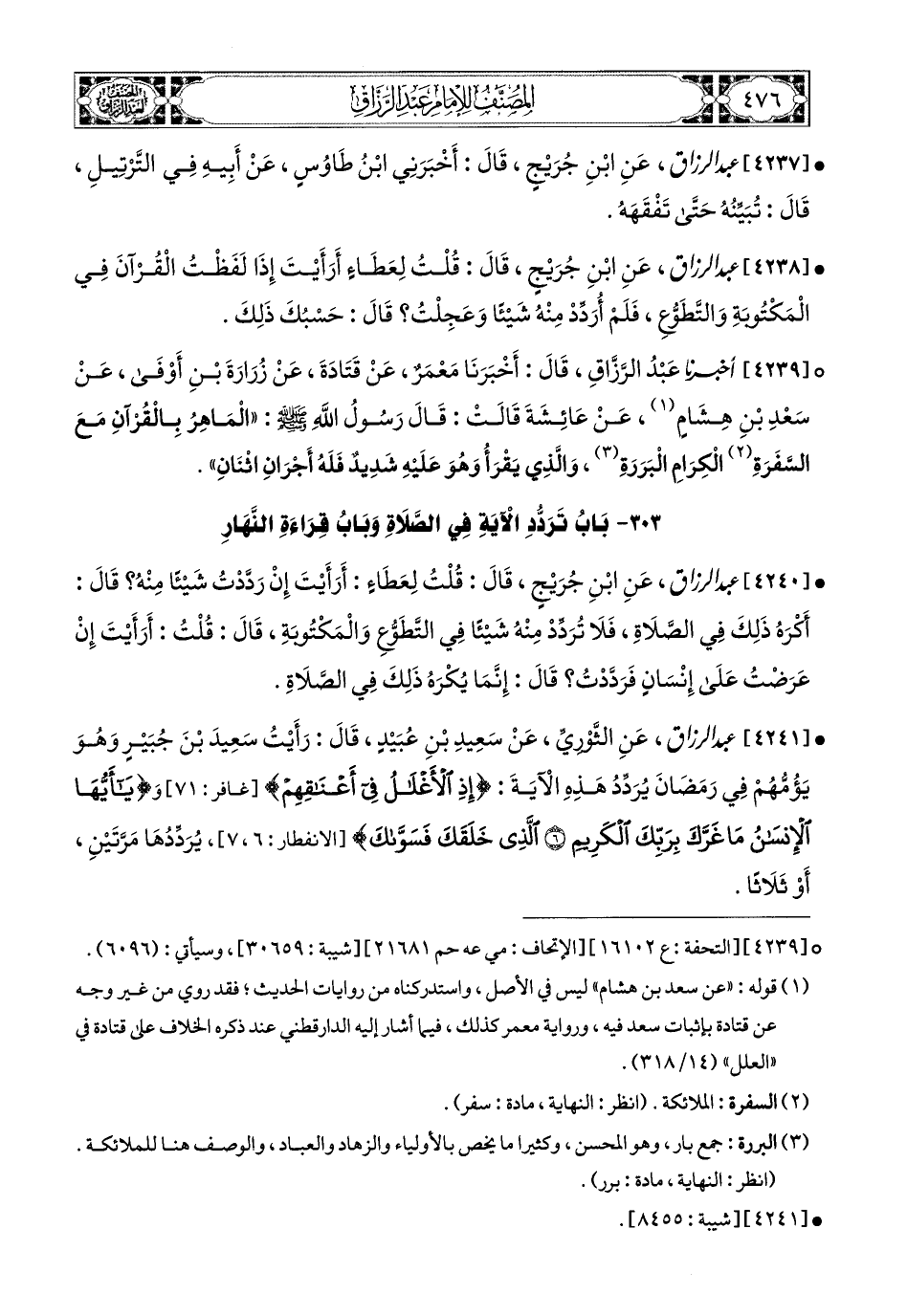 4239- أخبرنا عبد الرزاق، قَالَ: أَخْبَرَنَا مَعْمَرٌ، عَن قَتَادَةَ، عَن زُرَارَةَ بْنِ أَوْفَى، عَن سَعْدِ بْنِ هِشَامٍ، عَنْ عَائِشَةَ، قَالَتْ: قَالَ رَسُولُ اللهِ صَلَّى اللهُ عَلَيْهِ وَسَلَّمَ: المَاهِرُ بِالْقُرْآنِ مَعَ السَّفَرَةِ الْكِرَامِ الْبَرَرَةِ، وَالَّذِي يَقْرَأُ وَهُوَ عَلَيْهِ شَدِيدٌ، فَلَهُ أَجْرَانِ اثْنَانِ.