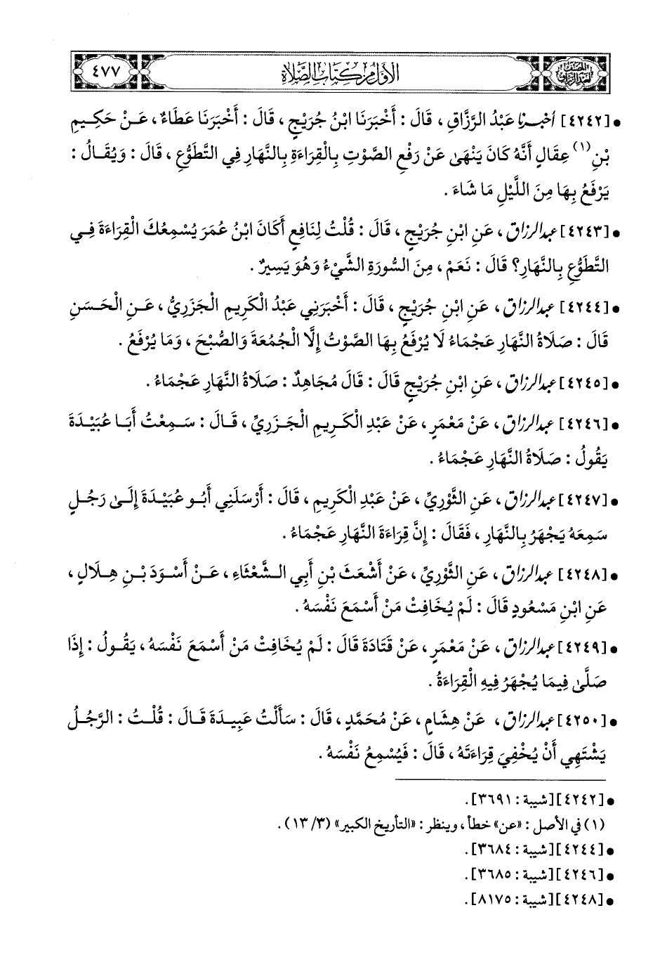 4242- أخبرنا عبد الرزاق، قَالَ: أَخْبَرَنَا ابْنُ جُرَيْجٍ، قَالَ: أَخْبَرَنَا عَطَاءٌ، عَن حَكِيمِ بْنِ عِقَالٍ، أَنَّهُ كَانَ يَنْهَى عَن رَفَعِ الصَّوْتِ بِالْقِرَاءَةِ بِالنَّهَارِ فِي التَّطَوُّعِ قَالَ: وَيُقَالُ: يَرْفَعُ بِهَا مِنَ اللَّيْلِ مَا شَاءَ.