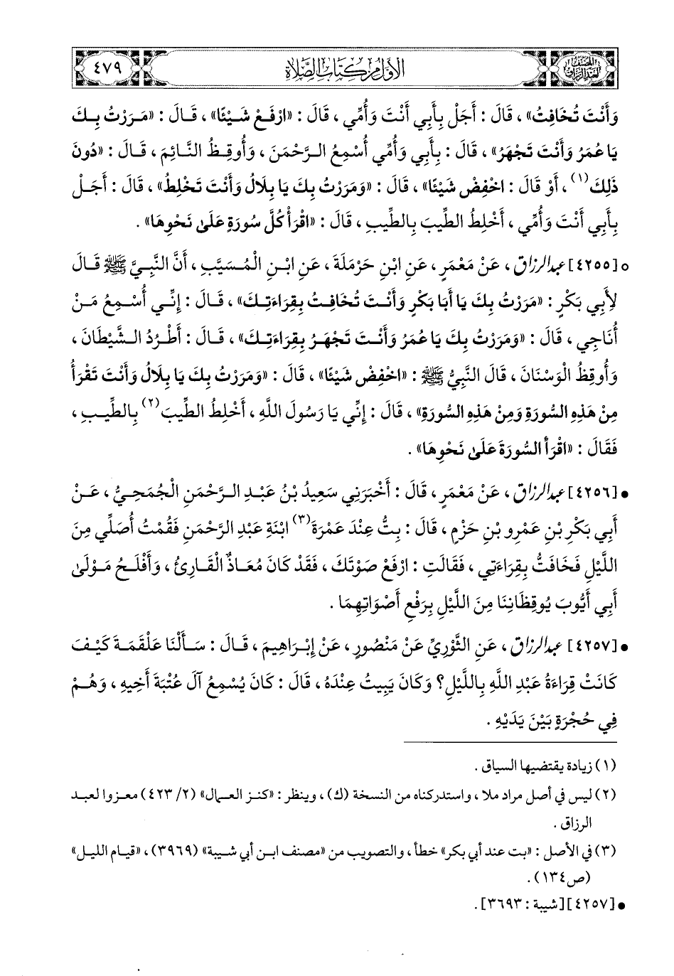 4255- عبد الرزاق، عَنْ مَعْمَرٍ، عَنِ ابْنِ حَرْمَلَةَ، عَنِ ابْنِ المُسَيَّبِ، أَنَّ النَّبِيَّ صَلَّى اللهُ عَلَيْهِ وَسَلَّمَ قَالَ لأَبِي بَكْرٍ: مَرَرْتُ بِكَ يَا أَبَا بَكْرٍ وَأَنْتَ تُخَافِتُ بِقِرَاءَتِكَ، قَالَ: إِنِّي أُسْمِعُ مَنْ أُنَاجِي، قَالَ: وَمَرَرْتُ بِكَ يَا عُمَرُ وَأَنْتَ تَجْهَرُ بِقِرَاءَتِكَ، قَالَ: اطْرُدُ الشَّيْطَانَ، وَأُوقِظُ الْوَسْنَانَ، قَالَ النَّبِيُّ صَلَّى اللهُ عَلَيْهِ وَسَلَّمَ: اخْفِضْ شَيْئًا، قَالَ: وَمَرَرْتُ بِكَ يَا بِلاَلُ وَأَنْتَ تَقْرَأُ مِنْ هَذِهِ السُّورَةَ وَمَنْ هَذِهِ السُّورَةِ، قَالَ: إِنِّي يَا رَسُولَ اللهِ، أَخْلِطُ الطِّيبَ بِالطِّيبِ، فَقَالَ: اقْرَأِ السُّورَةَ عَلَى نَحْوِهَا.
