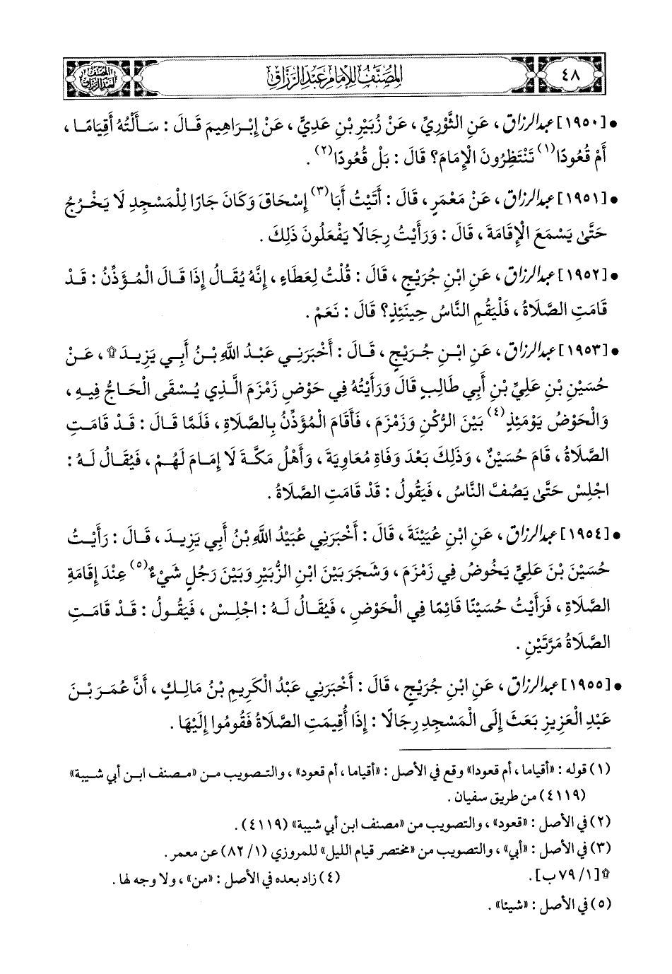 1950- عبد الرزاق، عَنِ الثَّورِيِّ، عَن زُبَيْرِ بْنِ عَدِيٍّ، عَن إِبرَاهِيمَ، قَالَ: سَأَلْتُهُ: أَقِيَامًا أَمْ قُعُودًا تَنْتَظِرُونَ الإِمَامَ؟ قَالَ: بَلْ قُعُودًا.