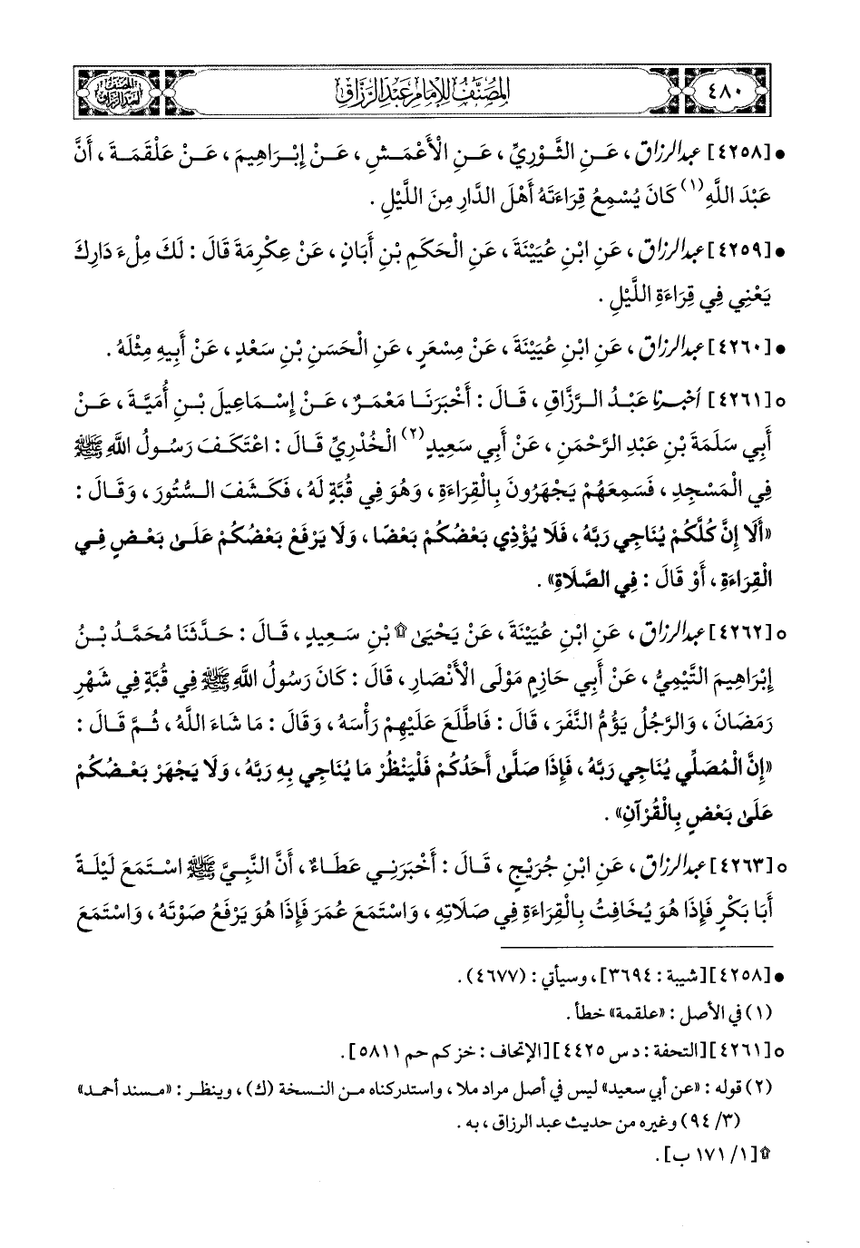 4258- عبد الرزاق، عَنِ الثَّورِيِّ، عَنِ الأَعمَشِ، عَن إِبرَاهِيمَ، عَنْ عَلْقَمَةَ؛ أَنَّ عَبدَ اللهِ كَانَ يُسْمِعُ قِرَاءَتَهُ أَهْلَ الدَّارِ مِنَ اللَّيْلِ.