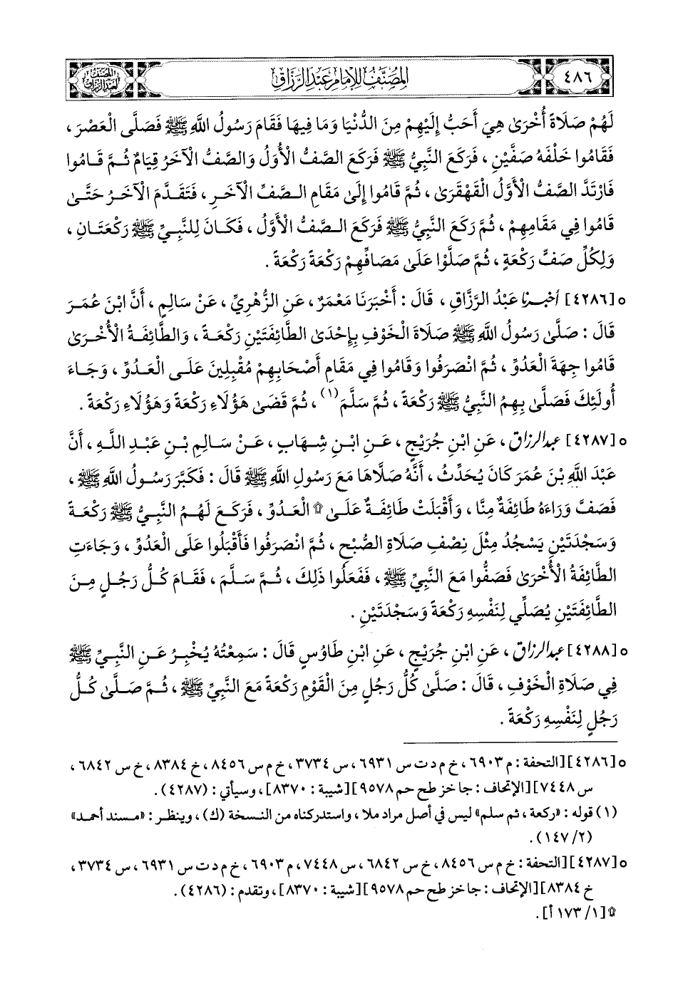 4288- عبد الرزاق، عَنِ ابْنِ جُرَيْجٍ، عَنِ ابْنِ طَاوُوسٍ، قَالَ: سَمِعْتُهُ يُخْبِرُ عَنِ النَّبِيِّ صَلَّى اللهُ عَلَيْهِ وَسَلَّمَ فِي صَلاَةِ الْخَوْفِ قَالَ: صَلَّى كُلُّ رَجُلٍ مِنَ الْقَوْمِ رَكْعَةً مَعَ النَّبِيِّ صَلَّى اللهُ عَلَيْهِ وَسَلَّمَ، ثُمَّ صَلَّى كُلُّ رَجُلٍ لِنَفْسِهِ رَكْعَةًً.