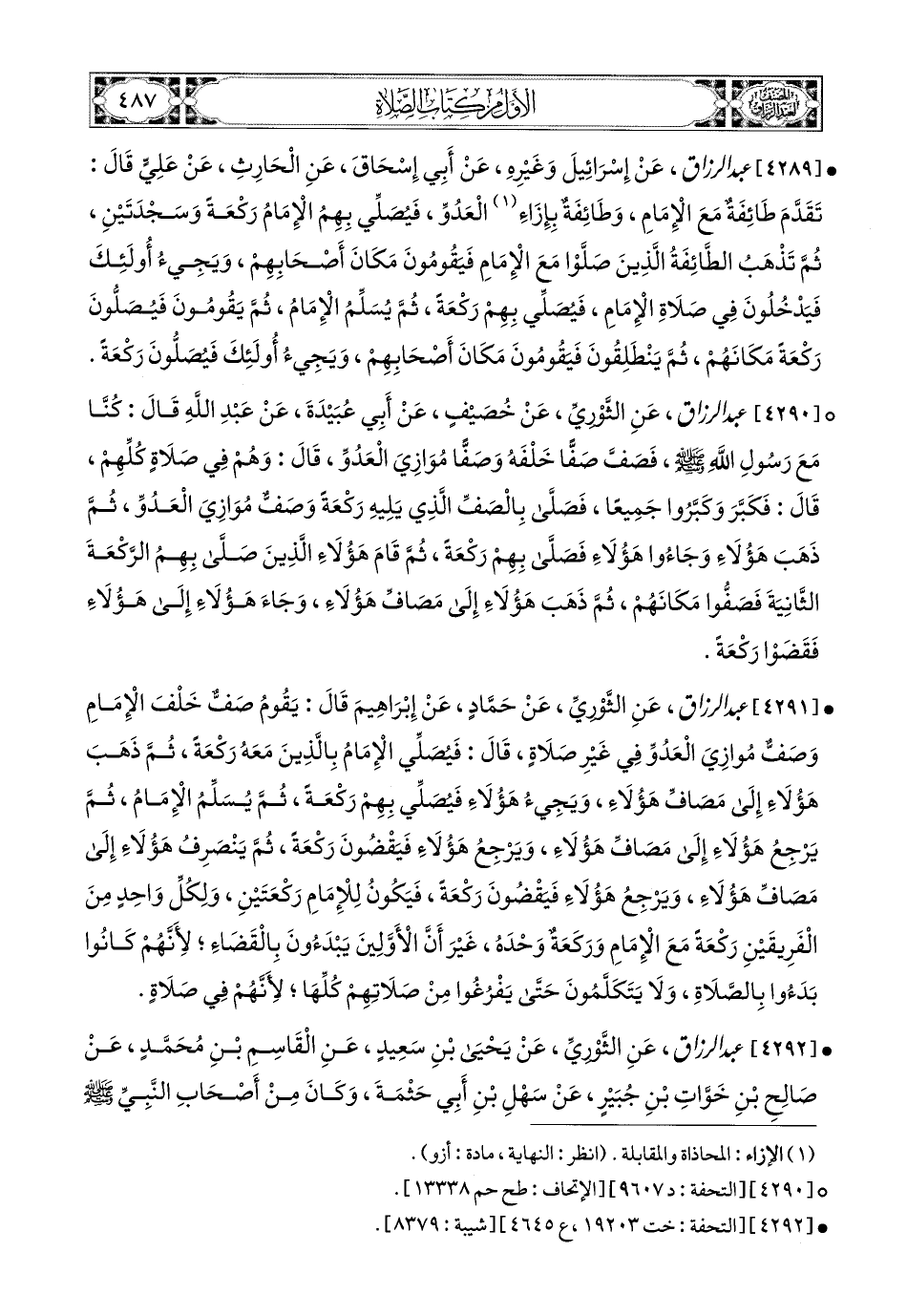 4291- عبد الرزاق، عَنِ الثَّورِيِّ، عَن حَمَّادٍ، عَن إِبرَاهِيمَ، قَالَ: يَقُومُ صَفٌّ خَلْفَ الإِمَامِ، وَصَفٌّ مُوَازِيَ الْعَدُوِّ فِي غَيْرِ صَلاَةٍ، قَالَ: فَيُصَلِّي الإِمَامُ بِالَّذِينَ مَعَهُ رَكْعَةً، ثُمَّ ذَهَبَ هَؤُلاَءِ إِلَى مَصَافِّ هَؤُلاَءِ، وَيَجِيءُ هَؤُلاَءِ فَيُصَلِّي بِهِمْ رَكْعَةً، ثُمَّ يُسَلِّمُ الإِمَامُ، ثُمَّ يَرْجِعُ هَؤُلاَءِ إِلَى مَصَافِّ هَؤُلاَءِ، وَيَرْجِعُ هَؤُلاَءِ فَيَقْضُونَ رَكْعَةً، ثُمَّ يَنْصَرِفُ هَؤُلاَءِ إِلَى مَصَافِّ هَؤُلاَءِ، وَيَرْجِعُ هَؤُلاَءِ فَيَقْضُونَ رَكْعَةً، فَيَكُونُ لِلإِمَامِ رَكْعَتَيْنِ، وَلِكُلِّ وَاحِدٍ مِنَ الْفَرِيقَيْنِ رَكْعَةٌ مَعَ الإِمَامِ وَرَكَعَةٌ وَحْدَهُ، غَيْرَ أَنَّ الأَوَّلِينَ يَبْدَؤُونَ بِالْقَضَاءِ؛ لأَنَّهُمْ كَانُوا بَدَؤُوا بِالصَّلاَةِ، وَلاَ يَتَكَلَّمُونَ، حَتَّى يَفْرُغُوا مِنْ صَلاَتِهِمْ كُلِّهَا؛ لأَنَّهُمْ فِي صَلاَةٍ.