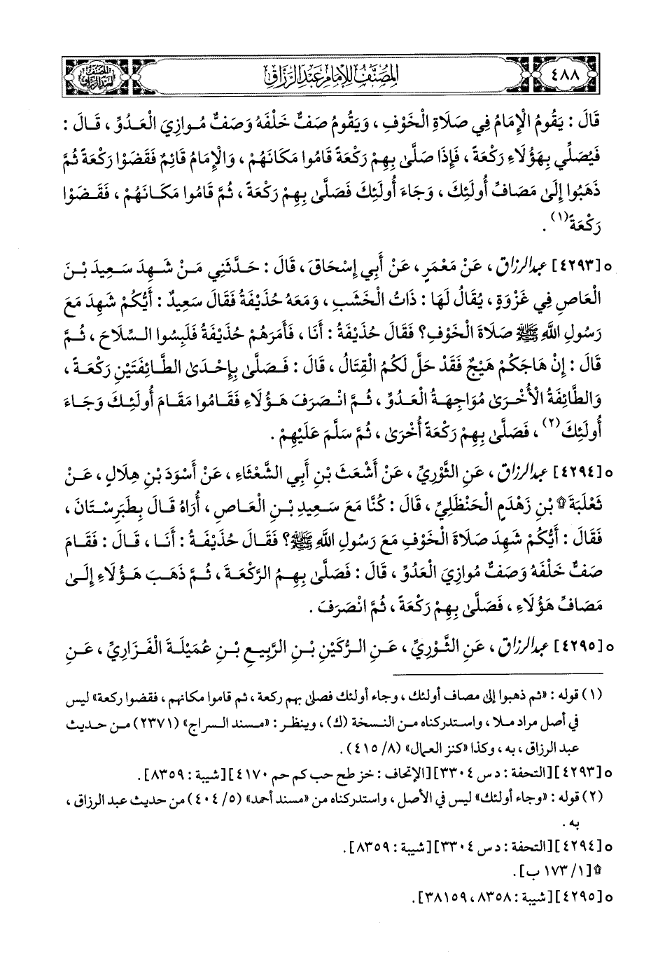 4293- عبد الرزاق، عَنْ مَعْمَرٍ، عَنْ أَبِي إِسْحَاقَ، قَالَ: حَدَّثَنِي مَنْ شَهِدَ سَعيدَ بن الْعَاصِ فِي غَزْوَةٍ يُقَالُ لَهَا: ذَاتُ الْخَشَبِ، وَمَعَهُ حُذَيْفَةُ، فَقَالَ سَعيدٌ: أَيُّكُمْ شَهِدَ مَعَ رَسُولِ اللهِ صَلَّى اللهُ عَلَيْهِ وَسَلَّمَ صَلاَةَ الْخَوْفِ؟ فَقَالَ حُذَيْفَةُ: أَنَا، فَأَمَرَهُمْ حُذَيْفَةُ فَلَبِسُوا السِّلاَحَ، ثُمَّ قَالَ: إِنْ هَاجَكُمْ هَيْجٌ فَقَدْ حَلَّ لَكُمُ الْقِتَالُ، قَالَ: فَصَلَّى بِإِحْدَى الطَّائِفَتَيْنِ رَكْعَةً، وَالطَّائِفَةُ الأُخْرَى مُوَاجِهَةُ الْعَدُوَّ، ثُمَّ انْصَرَفَ هَؤُلاَءِ فَقَامُوا مَقَامَ أُولَئِكَ، وَجَاءَ أُولَئِكَ، فَصَلَّى بِهِمْ رَكْعَةً أُخْرَى، ثُمَّ سَلَّمَ عَلَيْهِمْ.