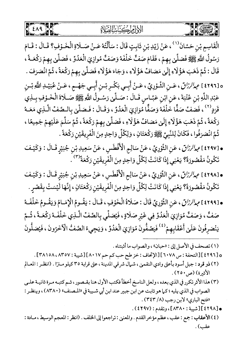 4296- عبد الرزاق، عَنِ الثَّورِيِّ، عَنْ أَبِي بَكْرِ بْنِ أَبِي جَهْمٍ، عَن عُبَيْدِ اللهِ بْنِ عَبدِ اللهِ بْنِ عُتْبَةَ، عَنِ ابْنِ عَبَّاسٍ، قَالَ: صَلَّى رَسُولُ اللهِ صَلَّى اللهُ عَلَيْهِ وَسَلَّمَ صَلاَةَ الْخَوْفِ بِذِي قَرَدٍ، فَصَفَّ صَفًّا خَلْفَهُ وَصَفًّا مُوَازِيَ الْعَدُوِّ، وَقَالَ: فَصَلَّى بِالصَّفِ الَّذِي مَعَهُ رَكْعَةً، ثُمَّ ذَهَبَ هَؤُلاَءِ إِلَى مَصَافِّ هَؤُلاَءِ، فَصَلَّى بِهِمْ رَكْعَةً، ثُمَّ سَلَّمَ عَلَيْهِمْ جَمِيعًا، ثُمَّ انْصَرَفُوا، فَكَانَ لِلنَّبِيِّ صَلَّى اللهُ عَلَيْهِ وَسَلَّمَ رَكْعَتَانِ، وَلِكُلِّ وَاحِدٍ مِنَ الْفَرِيقَيْنِ رَكْعَةٌ.