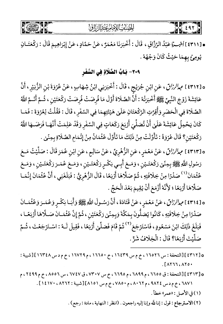 4312- عبد الرزاق، عَنِ ابْنِ جُرَيْجٍ، قَالَ: أَخْبَرَنِي ابْنُ شِهَابٍ، عَن عُرْوَةَ بْنِ الزُّبَيْرِ، أَنَّ عَائِشَةَ زَوْجَ النَّبِيِّ صَلَّى اللهُ عَلَيْهِ وَسَلَّمَ أَخْبَرَتْهُ، أَنَّ الصَّلاَةَ أَوَّلَ مَا فُرِضَتْ فُرِضَتْ رَكْعَتَيْنِ، ثُمَّ أَتَمَّ اللهُ الصَّلاَةَ فِي الْحَضَرِ وَأُقِرَّتِ الرَّكْعَتَانِ عَلَى هَيْئَتِهِمَا فِي السَّفَرِ.
