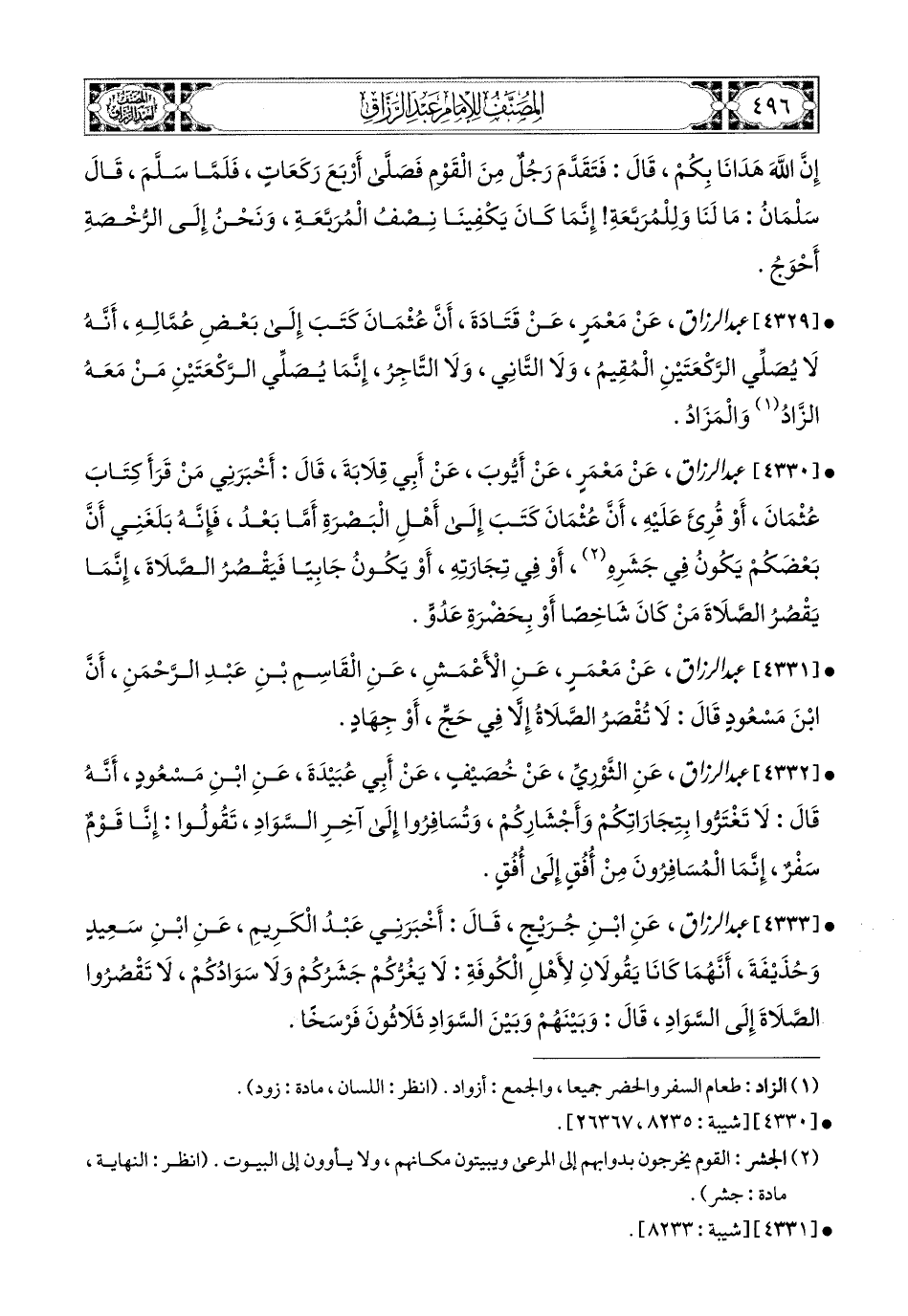 4330- عبد الرزاق، عَنْ مَعْمَرٍ، عَنْ أَيُّوبَ، عَنْ أَبِي قِلاَبَةَ قَالَ: أَخْبَرَنِي مَنْ قَرَأَ كِتَابَ عُثْمَانَ، أَوْ قُرِئَ عَلَيْهِ، أَنَّ عُثْمَانَ كَتَبَ إِلَى أَهْلِ الْبَصْرَةِ: أَمَّا بَعْدُ، فَإِنَّهُ بَلَغَنِي أَنَّ بَعْضَكُمْ يَكُونُ فِي جَشَرِهِ، أَوْ فِي تِجَارَتِهِ، أَوْ يَكُونُ جَابِيًا، فَيَقْصُرُ الصَّلاَةَ، إِنَّمَا يَقْصُرُ الصَّلاَةَ مَنْ كَانَ شَاخِصًا، أَوْ بِحَضْرَةِ عَدُوٍّ.