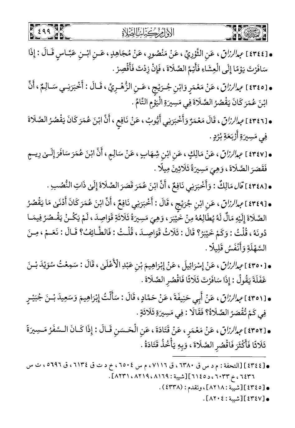 4345- عبد الرزاق، عَنْ مَعْمَرٍ، وَابْنِ جُرَيْجٍ، عَنِ الزُّهْرِيِّ، قَالَ: أَخْبَرَنِي سَالِمٌ، أَنَّ ابْنَ عُمَرَ كَانَ يَقْصُرُ الصَّلاَةَ فِي مَسِيرَةِ الْيَوْمِ التَّامِّ.
