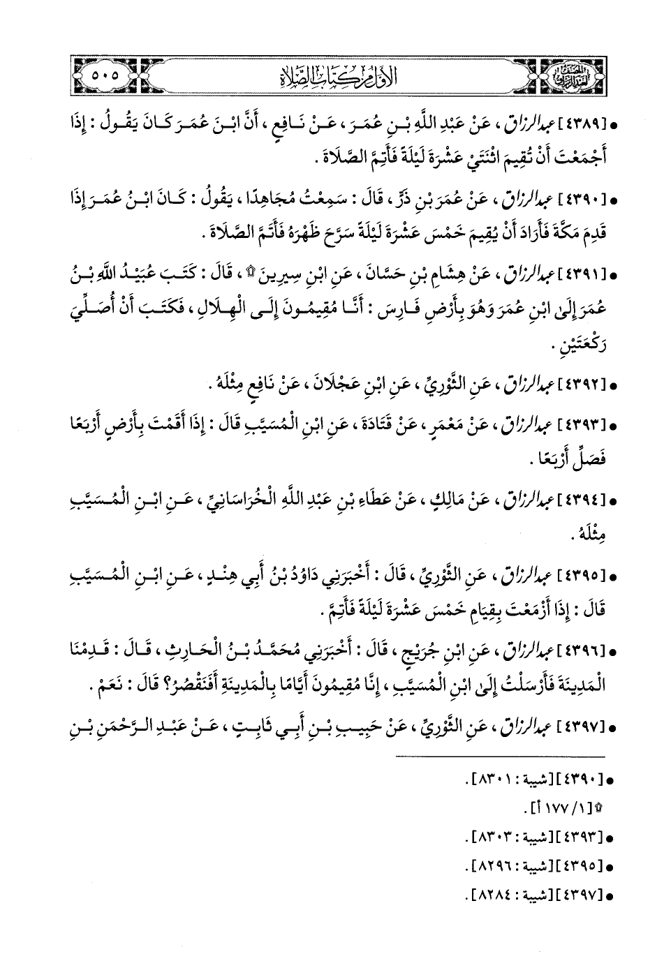 4391- عبد الرزاق، عَن هِشَامِ بْنِ حَسَّانَ، عَنِ ابْنِ سِيرِينَ، قَالَ: كَتَبَ عُبَيْدُ اللهِ بن عُمَرَ إِلَى ابْنِ عُمَرَ وَهُوَ بِأَرْضِ فَارِسَ: أَنَّا مُقِيمُونَ إِلَى الْهِلاَلِ، فَكَتَبَ أَنْ أُصَلِّيَ رَكْعَتَيْنِ.