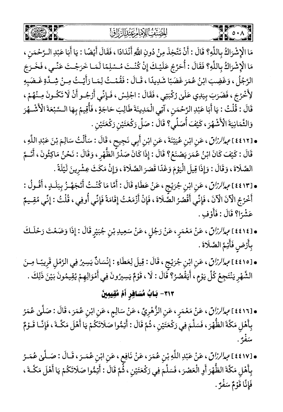 4417- عبد الرزاق، عَنْ عَبدِ اللهِ بْنِ عُمَرَ، عَن نَافِعٍ، عَنِ ابْنِ عُمَرَ، قَالَ: صَلَّى عُمَرُ بِأَهْلِ مَكَّةَ الظُّهْرَ، أَوِ الْعَصْرَ، فَسَلَّمَ فِي رَكْعَتَيْنِ، ثُمَّ قَالَ: أَتِمُّوا صَلاَتَكُمْ يَا أَهْلَ مَكَّةَ، فَإِنَّا قَوْمٌ سَفْرٌ.
