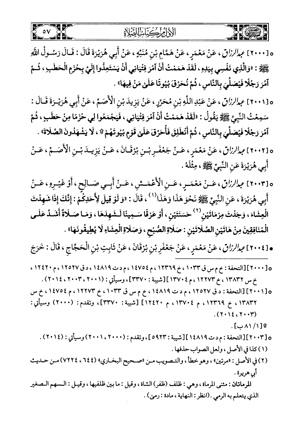 2001- عبد الرزاق، عَنْ عَبدِ اللهِ بْنِ مُحَرَّرٍ، عَن يَزِيدَ بْنِ الأَصَمِّ، عَنْ أَبِي هُرَيرَةَ، قَالَ: سَمِعْتُ النَّبِيَّ صَلَّى اللهُ عَلَيْهِ وَسَلَّمَ يَقُولُ: لَقَدْ هَمَمْتُ أَنْ آمُرَ فِتْيَانِي فَيَجْمَعُوا لِي حُزَمًا مِنْ حَطَبٍ، ثُمَّ آمُرَ رَجُلاً فَيُصَلِّيَ بِالنَّاسِ، ثُمَّ أَنْطَلِقَ، فَأُحَرِّقَ عَلَى قَوْمٍ بُيُوتَهُمْ لاَ يَشْهَدُونَ الصَّلاَةَ.