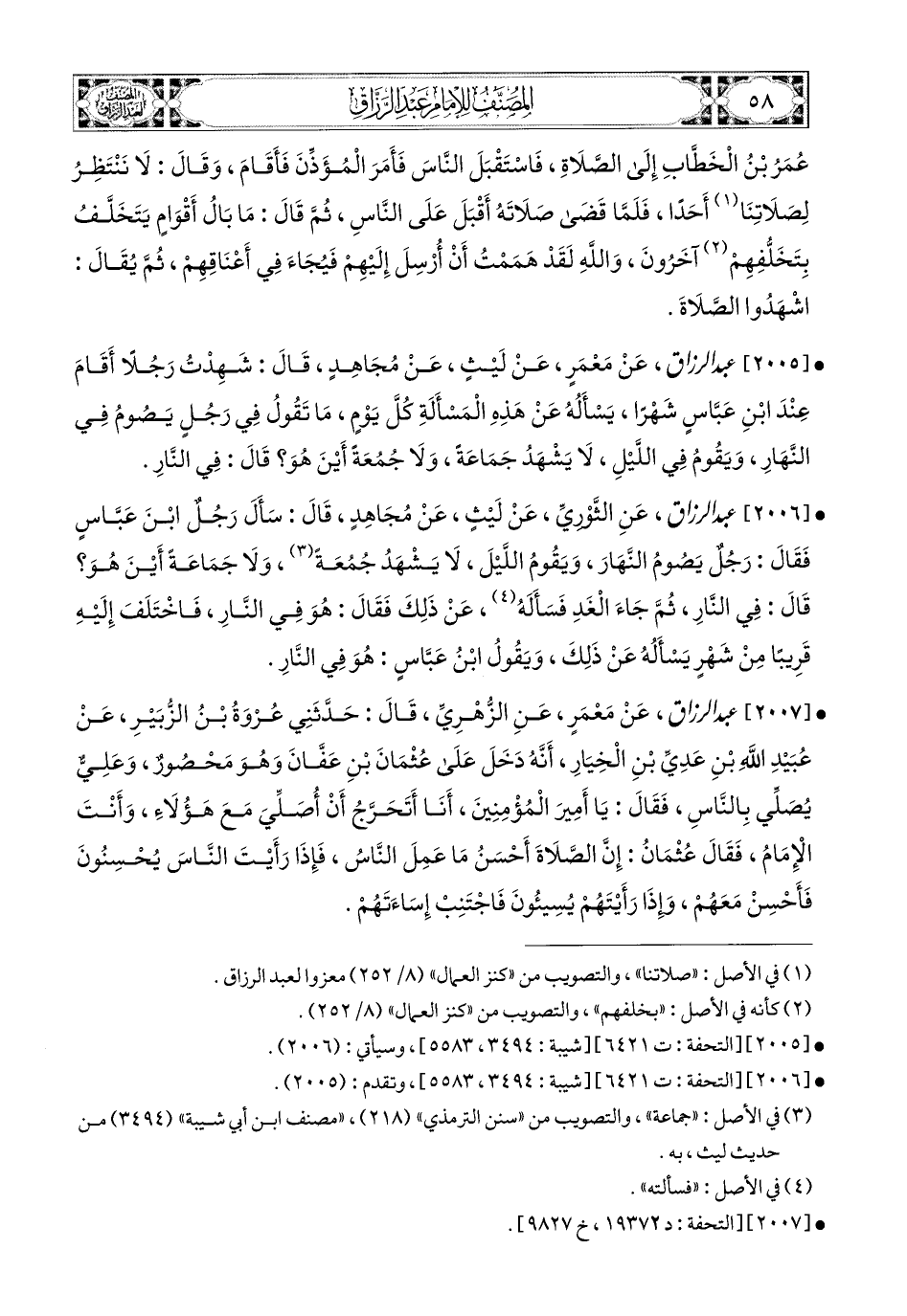 2007- عبد الرزاق، عَنْ مَعْمَرٍ، عَنِ الزُّهْرِيِّ، قَالَ: حَدَّثَنِي عُرْوَةُ بن الزُّبَيْرِ، عَن عُبَيْدِ اللهِ بْنِ عَدِيِّ بْنِ الْخِيَارِ، أَنَّهُ دَخَلَ عَلَى عُثْمَانَ بْنِ عَفَّانَ وَهُوَ مَحْصُورٌ، وَعَلِيٌّ يُصَلِّي بِالنَّاسِ، فَقَالَ: يَا أَمِيرَ المُؤْمِنِينَ، أَنَا أَتَحَرَّجُ أَنْ أُصَلِّيَ مَعَ هَؤُلاَءِ، وَأَنْتَ الإِمَامُ، فَقَالَ عُثْمَانُ: إِنَّ الصَّلاَةَ أَحْسَنُ مَا عَمِلَ النَّاسُ، فَإِذَا رَأَيْتَ النَّاسَ يُحْسِنُونَ فَأَحْسِنْ مَعَهُمْ، وَإِذَا رَأَيْتَهُمْ يُسِيؤُونَ فَاجْتَنِبْ إِسَاءَتَهُمْ.