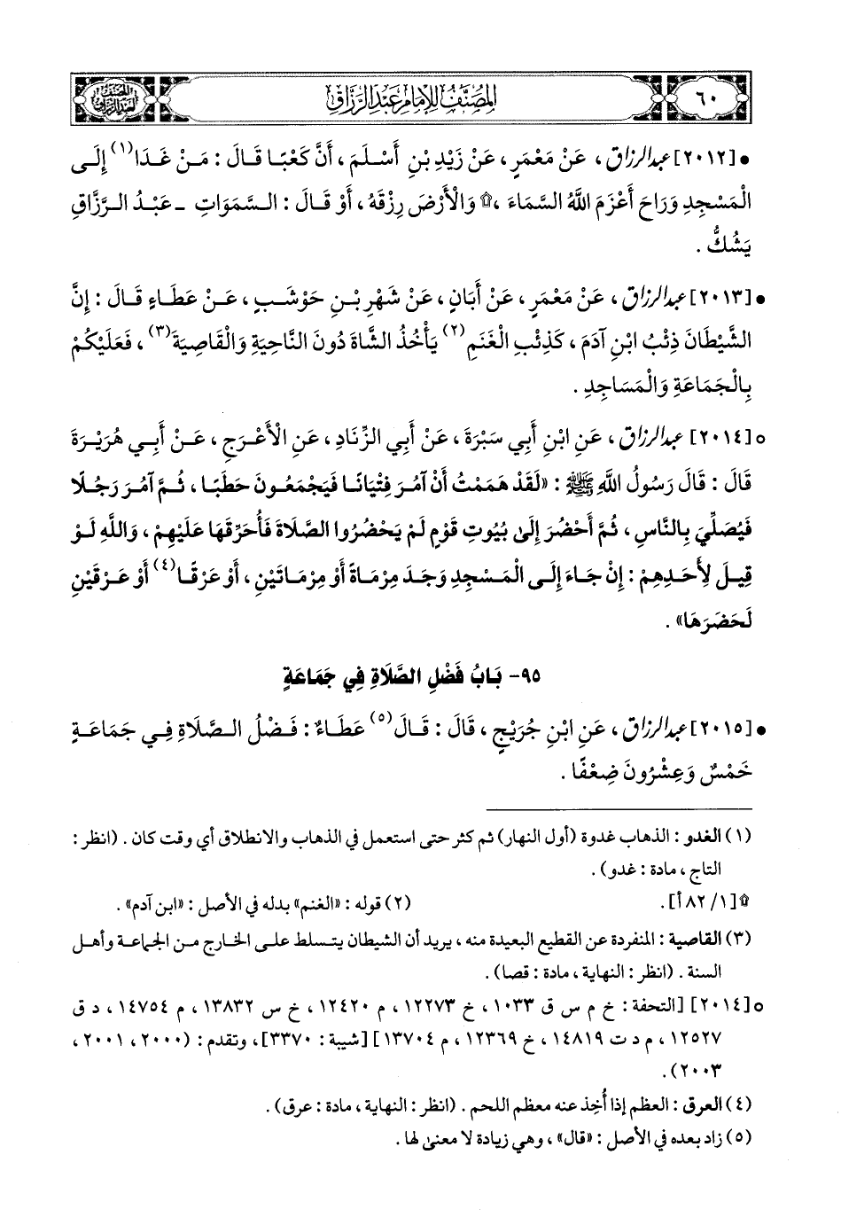 2012- عبد الرزاق، عَنْ مَعْمَرٍ، عَن زَيْدِ بْنِ أَسْلَمَ، أَنَّ كَعْبًا قَالَ: مَنْ غَدَا إِلَى المَسْجِدِ وَرَاحَ أَعْزَمَ اللهُ السَّمَاءَ وَالأَرْضَ رِزْقَهُ، أَوْ قَالَ: السَّمَاوَاتِ، عَبدُ الرَّزَّاقِ يَشُكُّ.