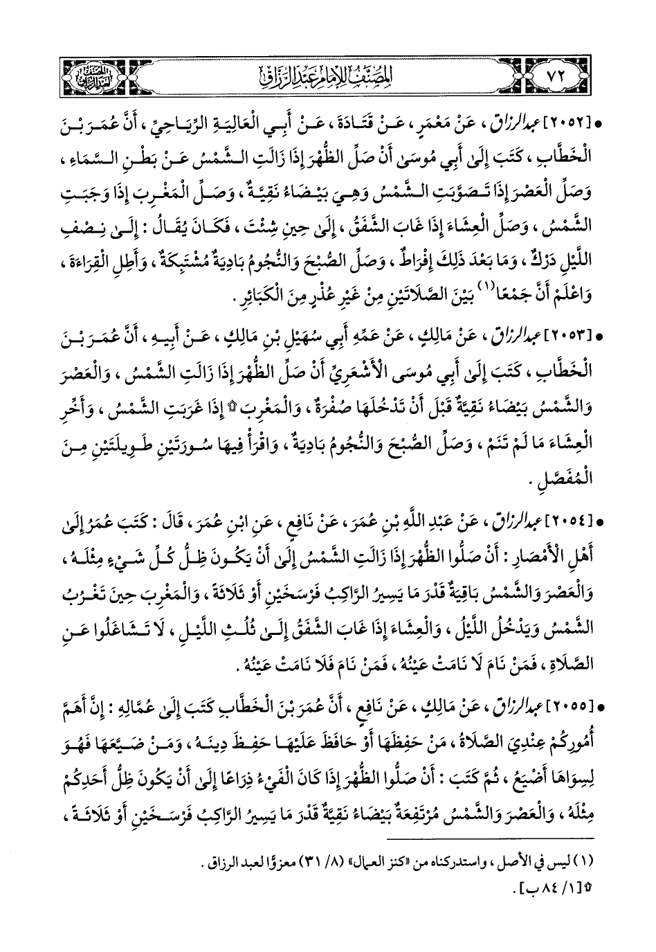 2055- عبد الرزاق، عَنْ مَالِكٍ، عَن نَافِعٍ، أَنَّ عُمَرَ بن الْخَطَّابِ كَتَبَ إِلَى عُمَّالِهِ: إِنَّ أَهَمُّ أُمُورِكُمْ عِنْدِي الصَّلاَةَ، مَنْ حَفِظَهَا أَوْ حَافَظَ عَلَيْهَا حَفِظَ دِينَهُ، وَمَنْ ضَيَّعَهَا فَهُوَ لِسِوَاهَا أَضْيَعُ، ثُمَّ كَتَبَ: أَنْ صَلُّوا الظُّهْرَ إِذَا كَانَ الْفَيْءُ ذِرَاعًا إِلَى أَنْ يَكُونَ ظِلُّ أَحَدِكُمْ مِثْلَهُ، وَالْعَصْرَ وَالشَّمْسُ مُرْتَفِعَةٌ بَيْضَاءُ نَقِيَّةٌ، قَدْرَ مَا يَسِيرُ الرَّاكِبُ فَرْسَخَيْنِ، أَوْ ثَلاَثَةً، وَالمَغْرِبَ إِذَا غَرَبَتِ الشَّمْسُ، وَالْعِشَاءُ إِذَا غَابَ الشَّفَقُ إِلَى ثُلُثِ اللَّيْلِ، فَمَنْ نَامَ فَلاَ نَامَتْ عَيْنُهُ، فَمَنْ نَامَ فَلاَ نَامَتْ عَيْنُهُ، وَالصُّبْحَ وَالنُّجُومُ بَادِيَةٌ مُشْتَبِكَةٌ.