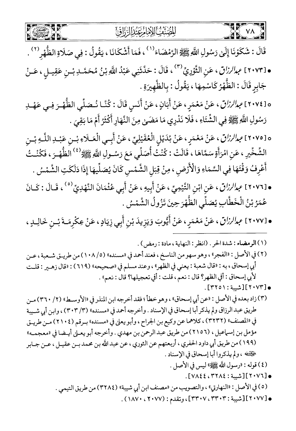 2073- عبد الرزاق، عَنِ الثَّورِيِّ، قَالَ: حَدَّثَنِي عَبدُ اللهِ بن مُحَمَّدِ بْنِ عَقِيلٍ، عَن جَابِرٍ قَالَ: الظُّهْرُ كَاسْمِهَا، يَقُولُ: بِالظَّهِيرَةِ.