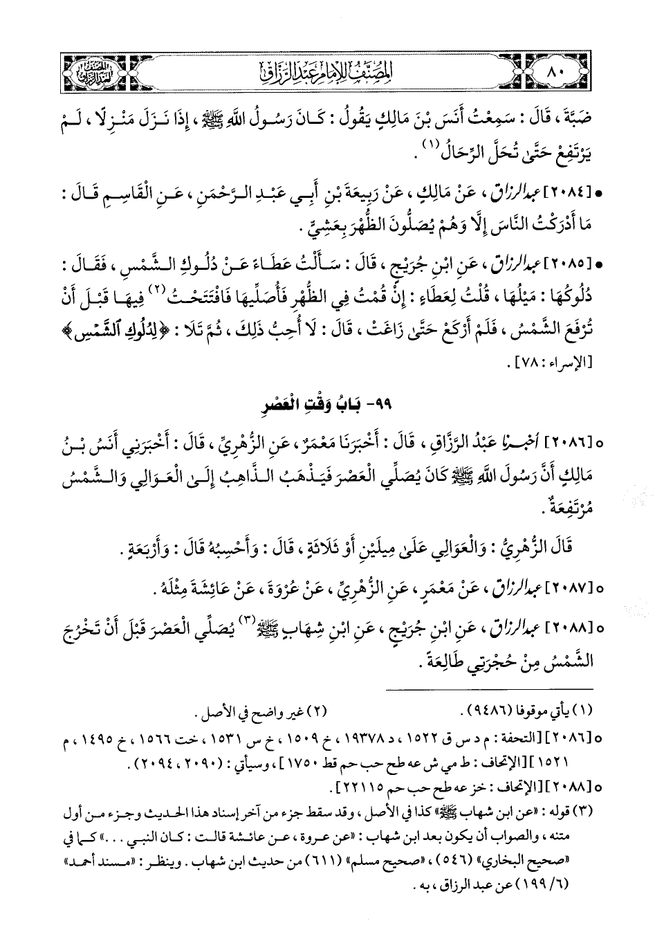 2086- أخبرنا عبد الرزاق، قَالَ: أَخْبَرَنَا مَعْمَرٌ، عَنِ الزُّهْرِيِّ، قَالَ: أَخْبَرَنِي أَنَسُ بن مَالِكٍ؛ أَنَّ رَسُولَ اللهِ صَلَّى اللهُ عَلَيْهِ وَسَلَّمَ كَانَ يُصَلِّي الْعَصْرَ فَيَذْهَبُ الذَّاهِبُ إِلَى الْعَوَالِي وَالشَّمْسُ مُرْتَفِعَةٌ.