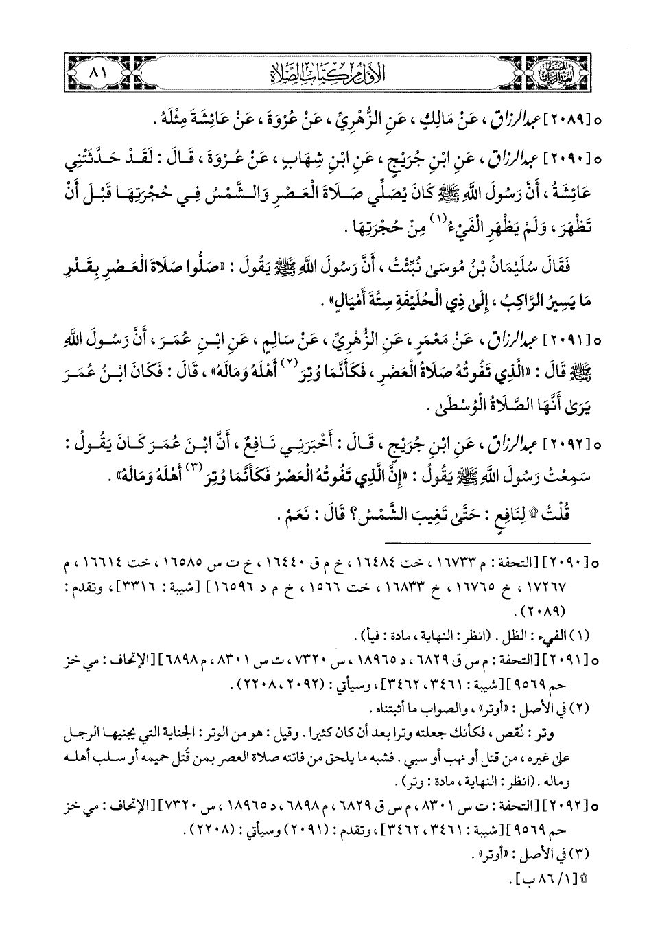 2091- عبد الرزاق، عَنْ مَعْمَرٍ، عَنِ الزُّهْرِيِّ، عَن سَالِمٍ، عَنِ ابْنِ عُمَرَ، أَنَّ رَسُولَ اللهِ صَلَّى اللهُ عَلَيْهِ وَسَلَّمَ قَالَ: الَّذِي تَفُوتُهُ صَلاَةُ الْعَصْرِ، فَكَأَنَّمَا وُتِرَ أَهْلَهُ وَمَالَهُ.