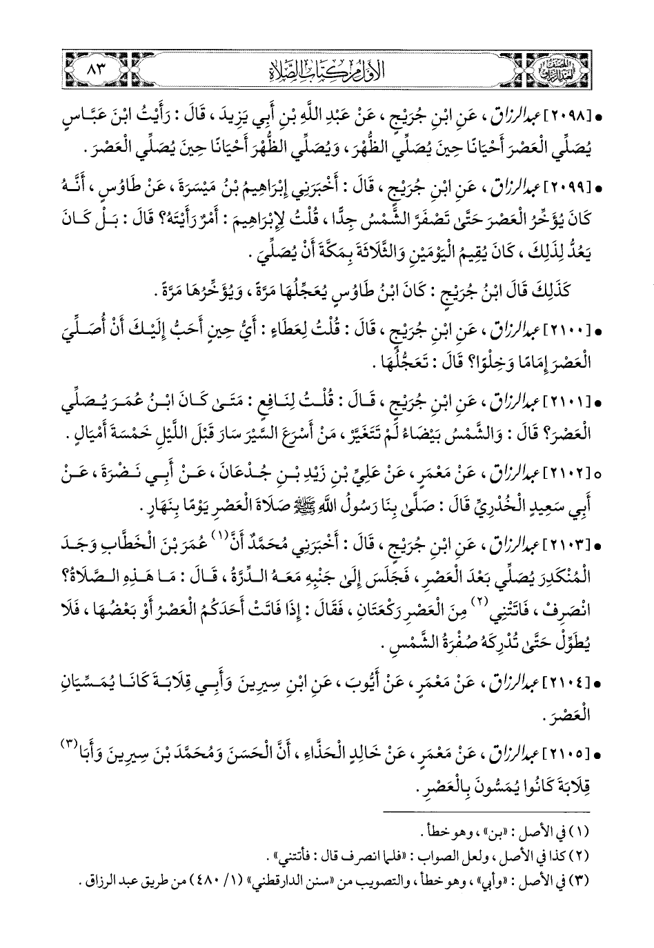2104- عبد الرزاق، عَنْ مَعْمَرٍ، عَنْ أَيُّوبَ، عَنِ ابْنِ سِيرِينَ، وَأَبِي قِلاَبَةَ: كَانَا يُمَسِّيَانِ الْعَصْرَ.